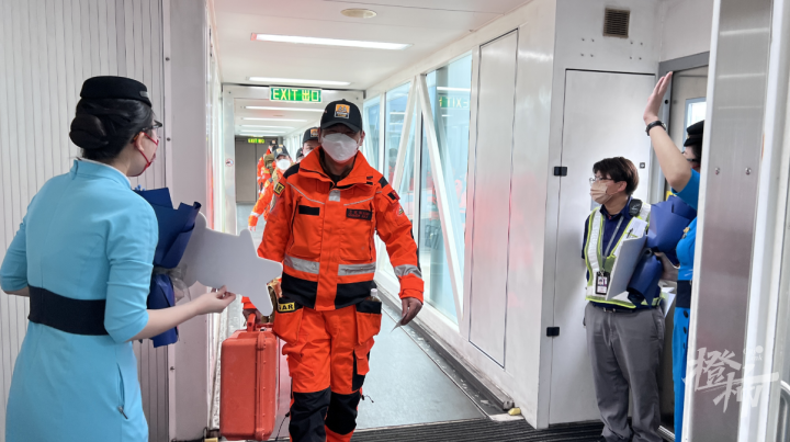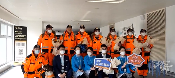 前天,當公羊救援隊7名隊員由香港轉機乘坐廈航MF8656航班返回杭州,航班工作人員就已經在通道口迎接了。