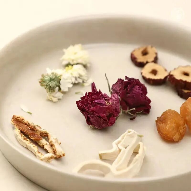 玫瑰、桂圓、紅棗、貢白菊、川橘皮、佛手柑