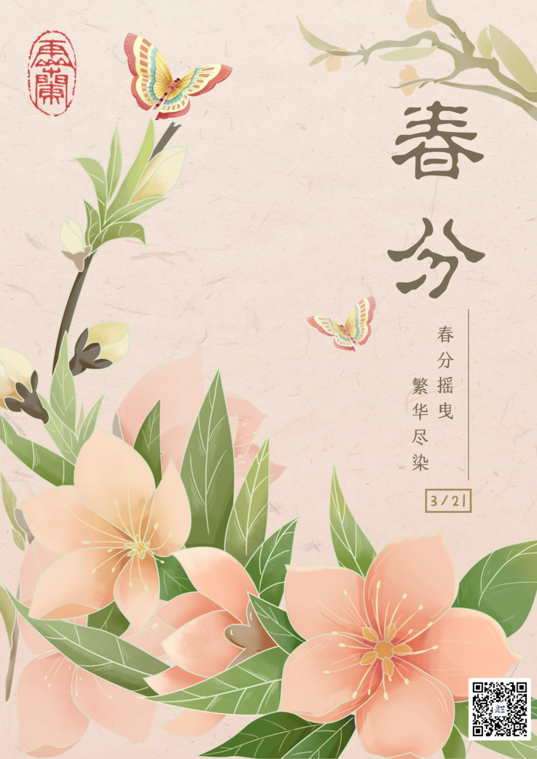 春分,古時又稱為“日中”、“日夜分”、“仲春之月”,適逢每年公曆3月20日或21日,當太陽到達黃經0度(春分點)時開始。因這天晝夜長短平均,正當春季九十日之半,故稱“春分”。