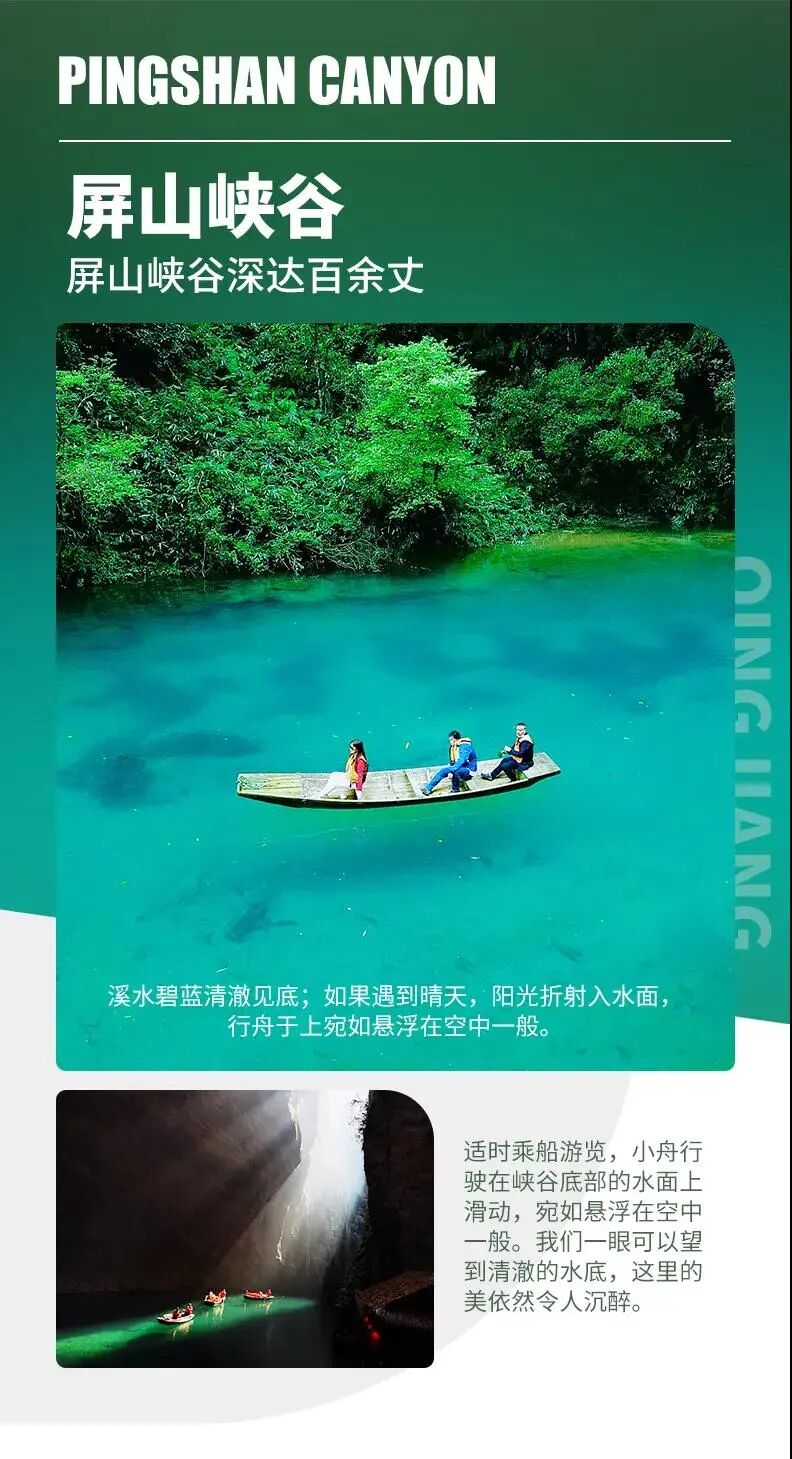 我們乘車前往【屏山峽谷】(車程約3小時,遊覽約3.5小時),屏山峽谷被譽為“中國仙本那”,這裡是恩施旅遊必覽之地。屏山四周峭壁懸空,碧水環繞,青山翠綠,在峽谷中的水面遊弋,抬頭看去,四周峭壁聳立,溪流環繞。