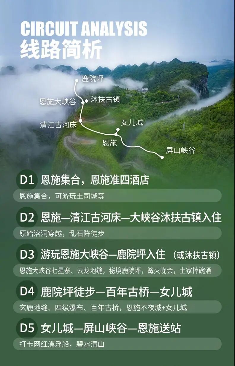 2.住宿:女兒城三星精選酒店(參考土家土居客棧)1晚、鹿院坪硫年民宿或玄鹿客棧1晚、大峽谷三星民宿1晚、恩施火車站四星酒店(參考紐賓凱希璞酒店)1晚;