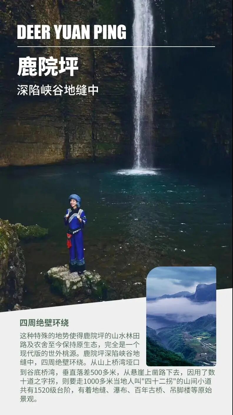 我們將遊玩鹿院坪這個與“鹿“結緣的傳統村落景區,徒步玄鹿地縫,這是一條幽長靜謐、清涼的峽谷,峽谷裡面有著一條小溪流和多處瀑布,有著被當地土著稱為“水簾洞”的四級瀑布,都是絕色美景。
