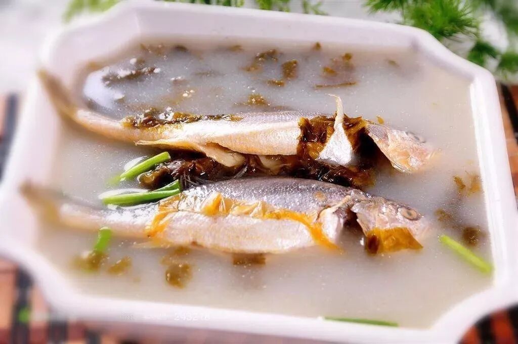 原料:小黃魚250克,素油100克,雪菜25克,肉湯250克,黃酒、鹽、糖、澱粉、味精、蔥、薑末、麻油適量。