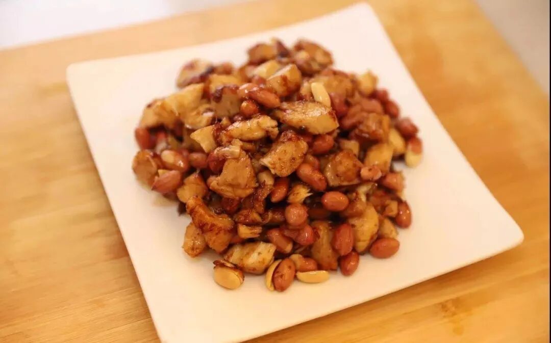 原料:花生米250克,雞脯肉丁100克,素油50克。黃酒、鹽、澱粉、味精、姜、蔥末適量。