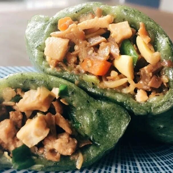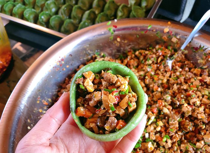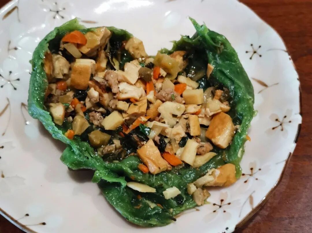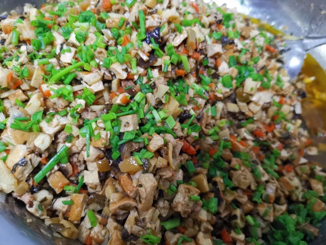 餡料是肉丁、鮮筍丁、幹筍丁、豆腐乾、胡蘿蔔幹、香菇丁,還會加一點點的榨菜或者鹹菜來提味,用土菜油炒,剛炒好的餡料,撒上一把蔥花,太香了。