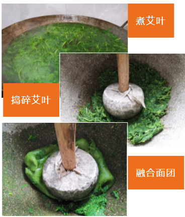 讓艾葉和麵團完全融合後,做成麵糰待用,所以,他們家的清明果,能經常看到沒有完全打碎的艾葉條呢,特香。