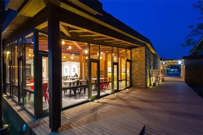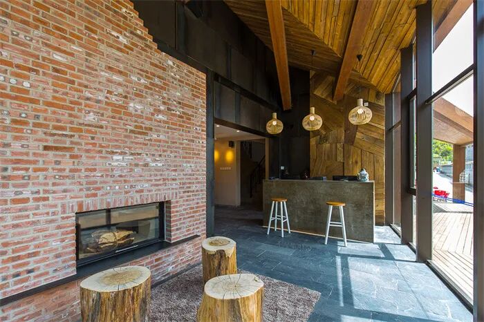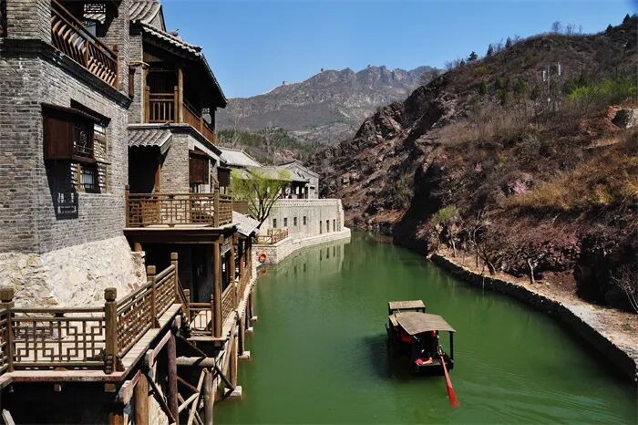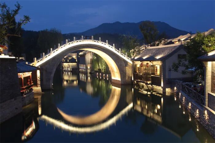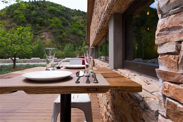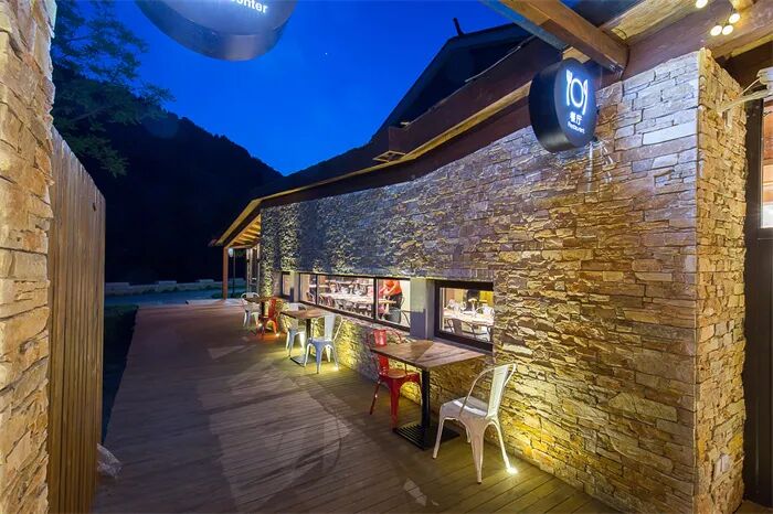 酒店臨近水源,背靠青山,白天可以去周邊的古北水鎮,夜晚在司馬臺長城上俯瞰小鎮上的燈火人家,巍峨挺拔的長城盤臥山頂雲端,明黃的燈光映襯著古城磚如金龍一般。