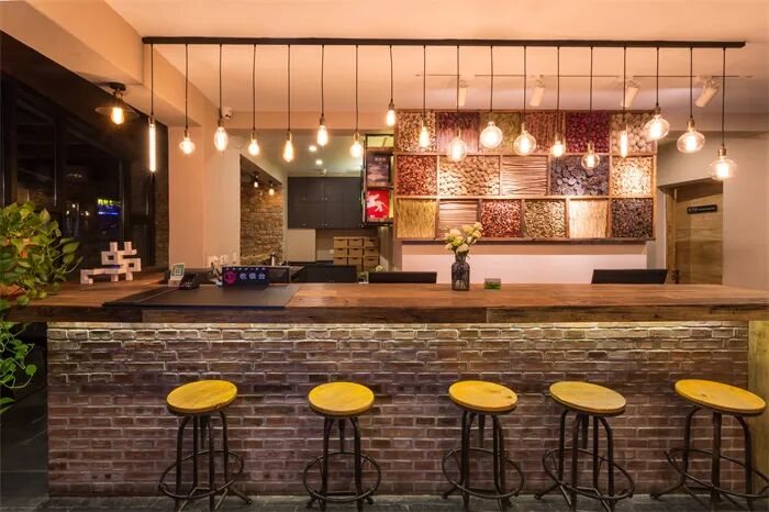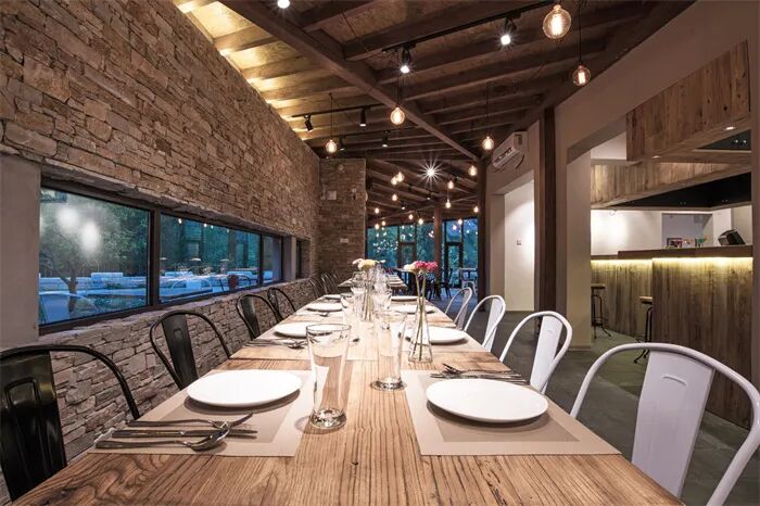 簡約的方桌設計為用餐帶來儀式感,石磚錯落的牆飾也讓人眼前一亮。