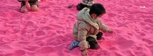 一片粉色沙池映入眼簾,在陽光的照耀下閃閃發光粉色的沙礫細軟至極感受粉色給我們帶來的,無限美好,盡情玩耍,拍照、拍視頻,留下這一美好時刻。