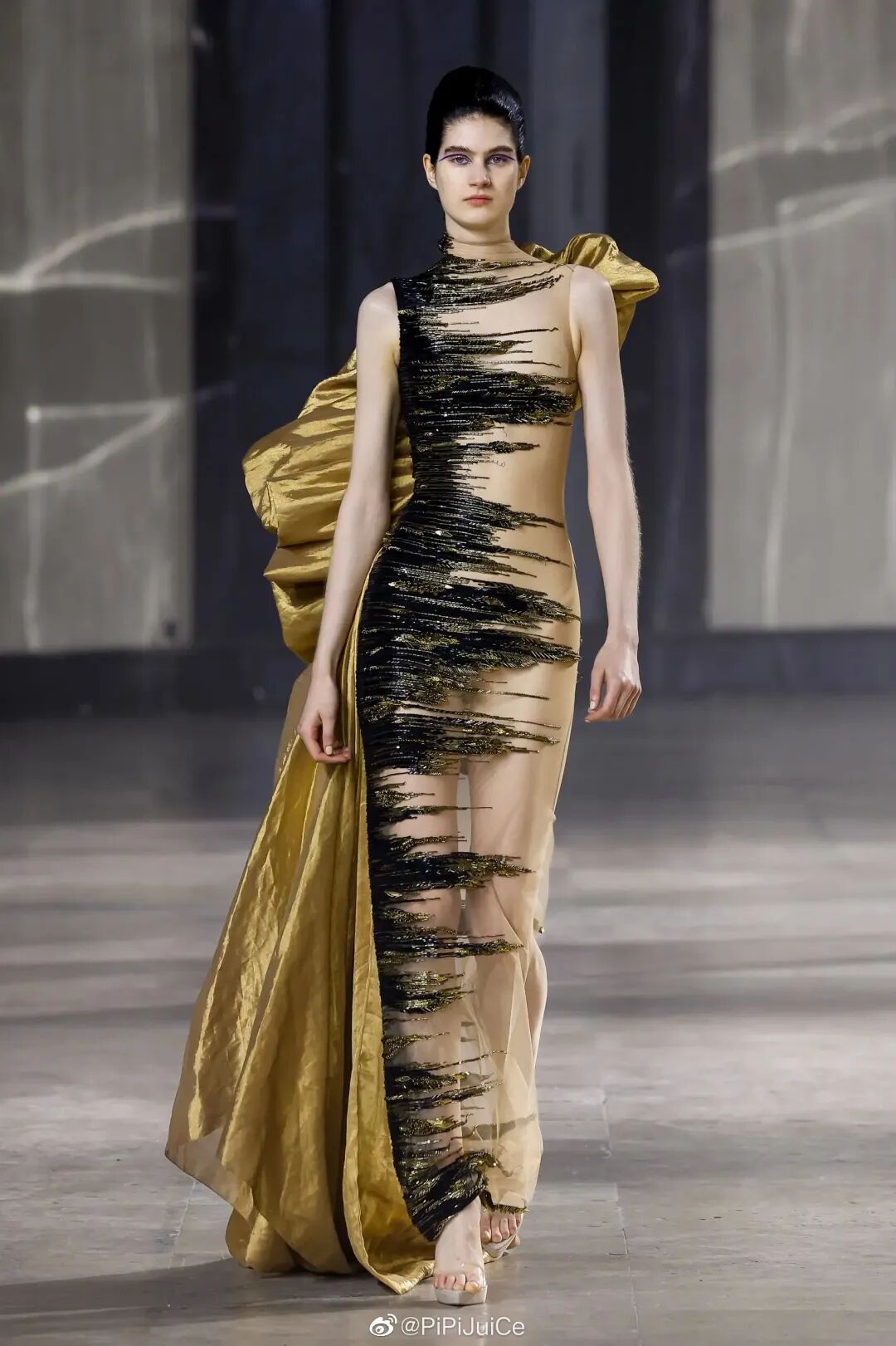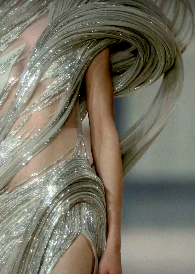 雕塑般的禮服外觀,化動為靜的織物飄揚美,星雲沙礫般的廓形。