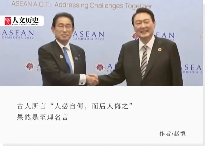 3月16日,在出賣了國家和民族的尊嚴之後,韓國總統尹錫悅啟程前往日本,與日本首相岸田文雄舉行會談,進行韓國總統時隔12年首次對日專訪。然後就在當天下午,尹錫悅在東京首相官邸同岸田文雄舉行會談前的歡迎儀式時,本是向本國國旗行撫胸禮的尹錫悅,卻被日媒NHK現場轉播畫面刻意用日本國旗擋住了韓國國旗,看起來就像是尹錫悅與岸田一起向日本國旗鞠躬。面對如此刻意的侮辱,韓國政府卻也只能唾面自乾地表示:“向對方國旗致敬是日本方面的慣例”。