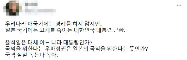 韓國網友留言:“不在我國國歌響起時敬禮,但向日本國旗低頭。尹錫悅到底是哪個國家的總統?嘴上說著‘為了國家利益’的右派政權,難道就是為了日本的國家利益?我們國家的立場真是慢慢消失了”