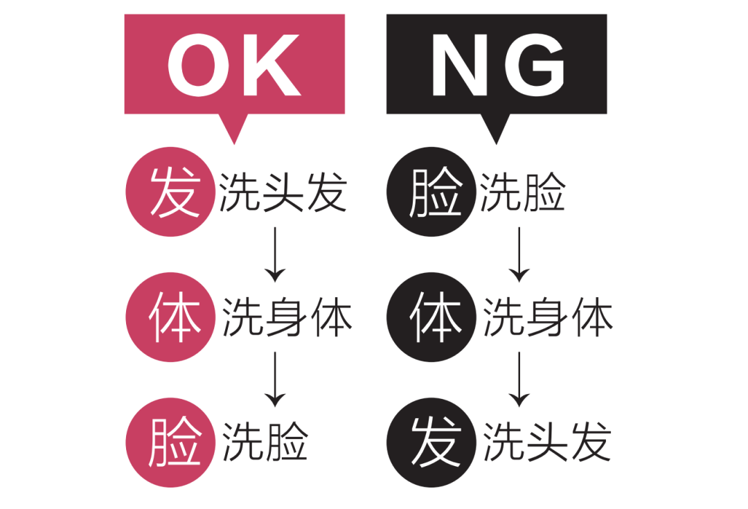 如果洗完臉和身體,再洗頭髮,頭髮的汙垢和護髮素的油分就會殘留在本來已經清潔好的面部。這也可能造成皮膚粗糙等皮膚問題。所以洗完頭髮再洗臉和身體。