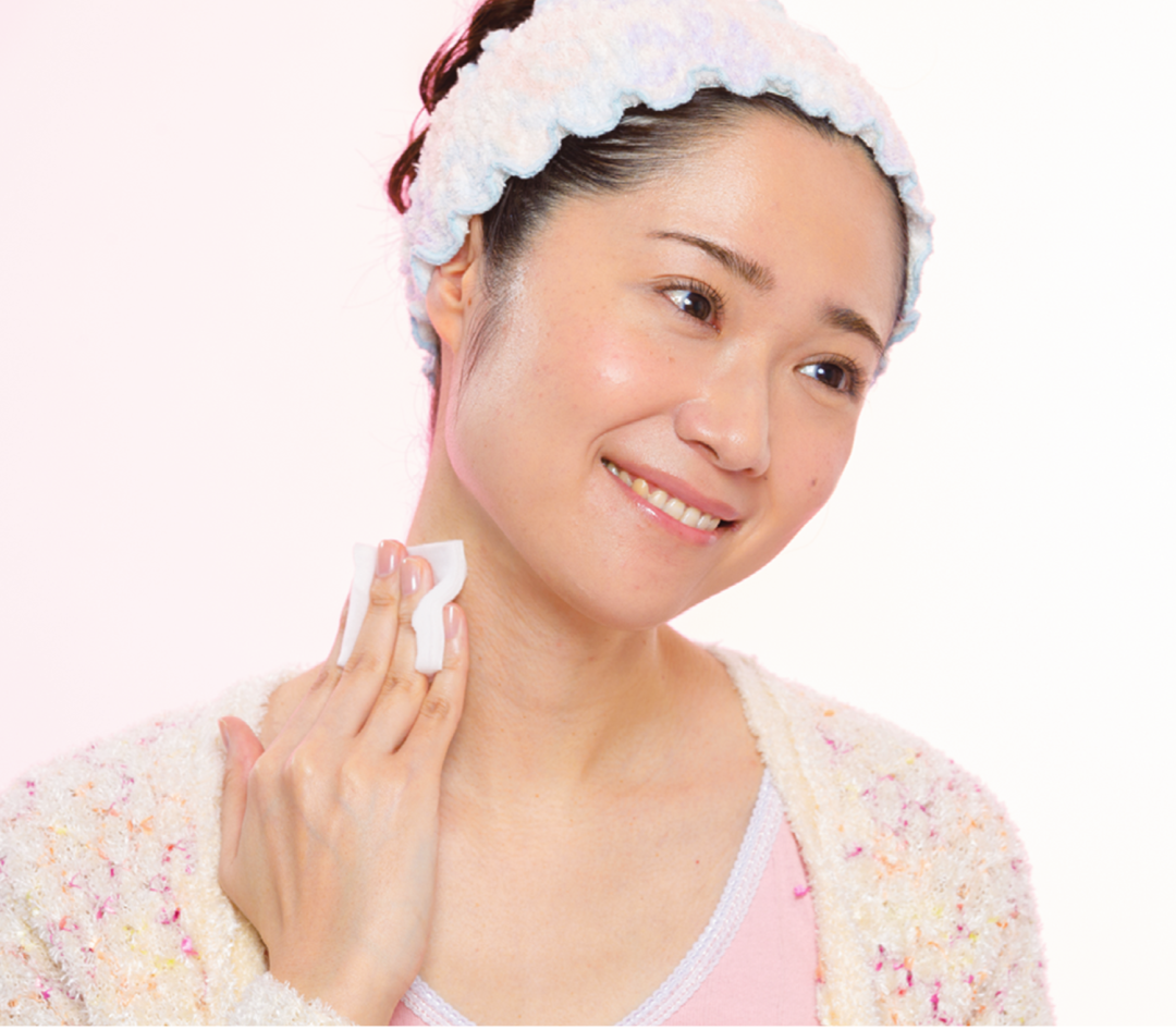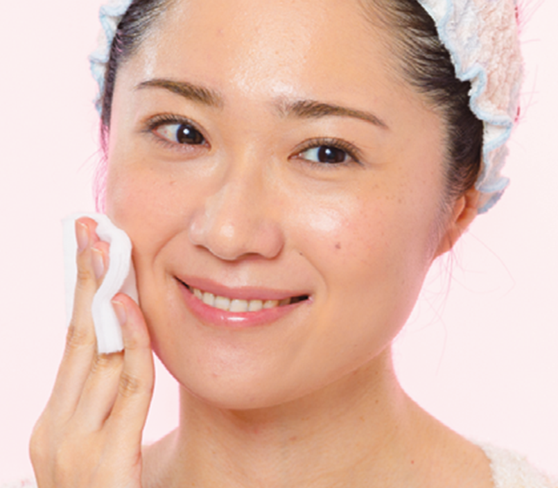 在化妝棉上滴規定量的化妝水,塗在臉上。相比用手塗,化妝棉還能擦去皮膚上殘留的汙垢和毛巾的棉線,令化妝水充分滲透。