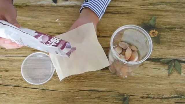 首先我們將大蒜剝開,剝成一瓣一瓣的,裝進塑料瓶中,接著我們準備一張紙巾,在紙巾上放入一勺小蘇打,把它包好,放到塑料瓶中,擰緊瓶蓋,放到通風的地方