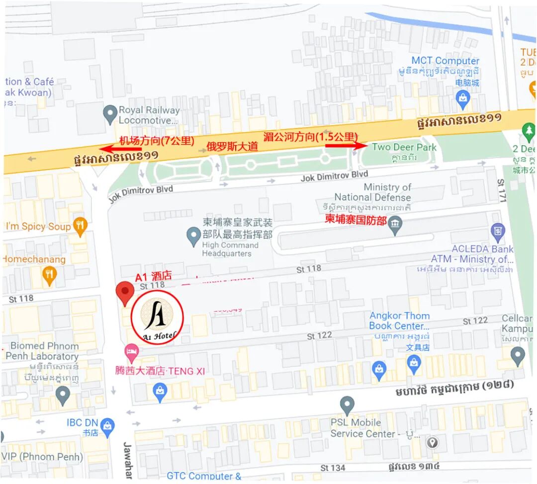 A1酒店(Google地圖搜索“A1酒店”),位於金邊市馬卡拉區215路10號,位於市中心區,緊鄰俄羅斯大道,距離金邊機場7Km,交通方便。