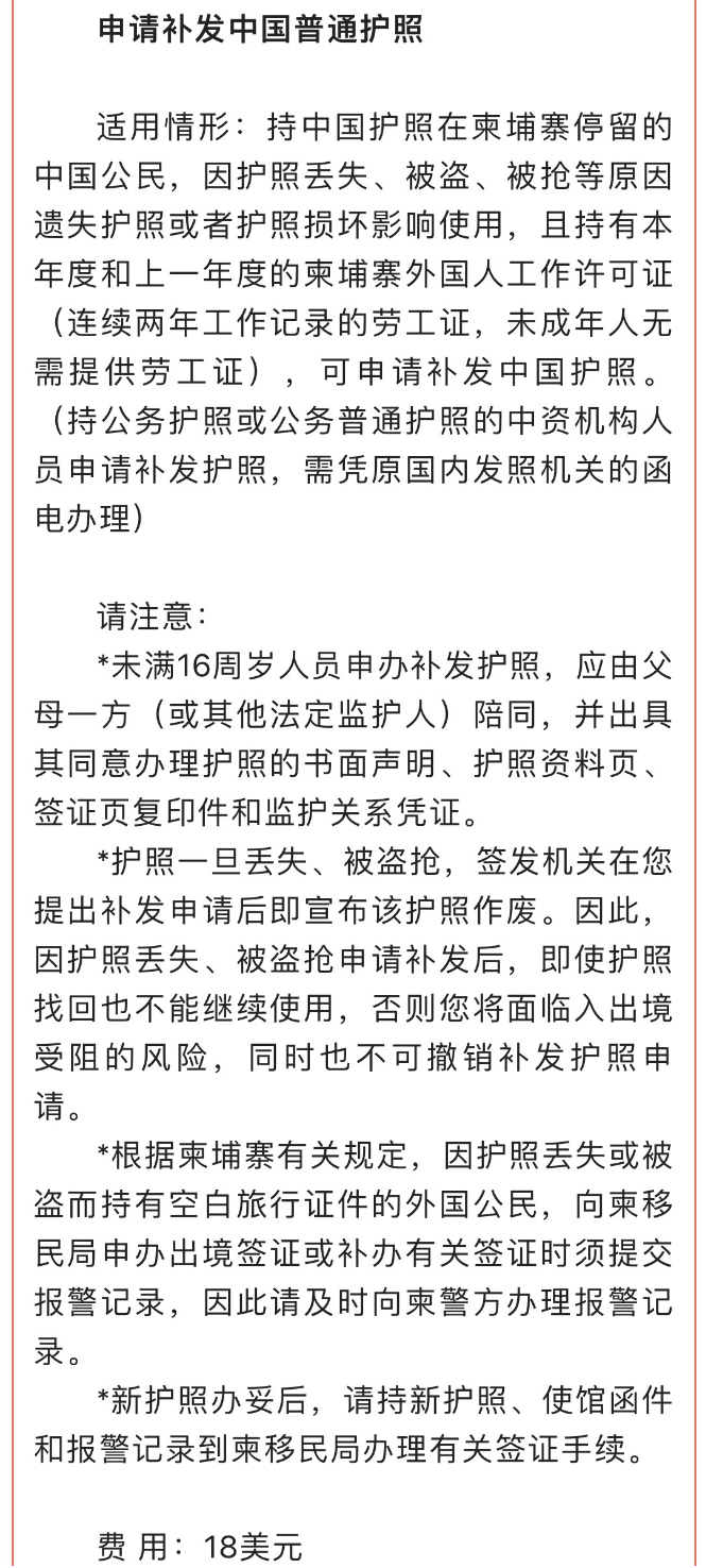 中國駐柬埔寨使館公佈了補發、換髮中國護照相關要求及費用標準,如下: