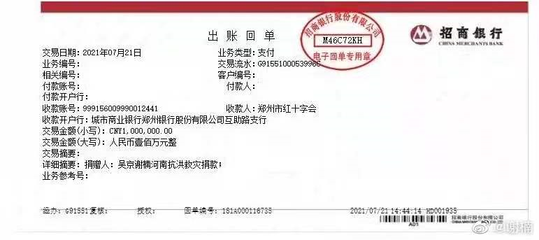 河南遭遇特大暴雨,吳京謝楠捐款100萬馳援河南等。