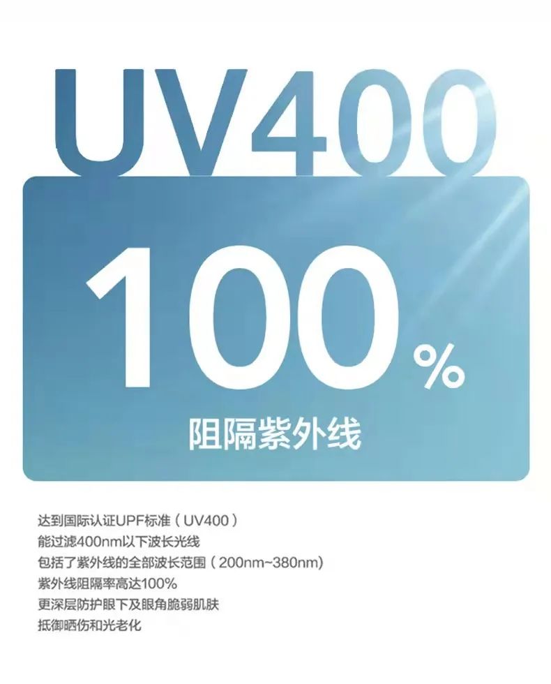 達到了國際認證的UPF標準,99%阻隔紫外線。吊打那些不能防曬的墨鏡!