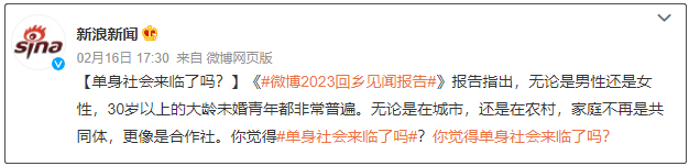 《微博2023回鄉見聞報告》指出,無論是男性還是女性,30歲以上的大齡未婚青年都非常普遍。