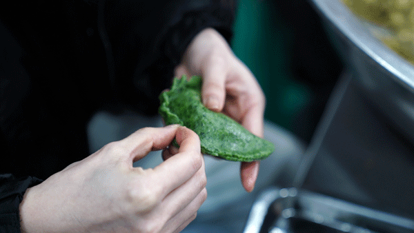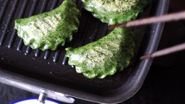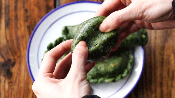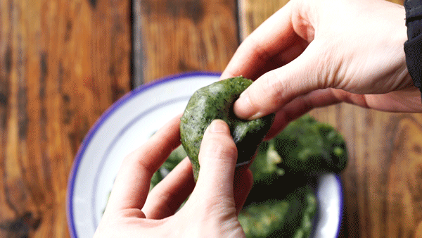 比起直接用工業艾草粉或是艾草榨汁給青團上色,我們選擇了更耗時的手工汆熟搗爛。