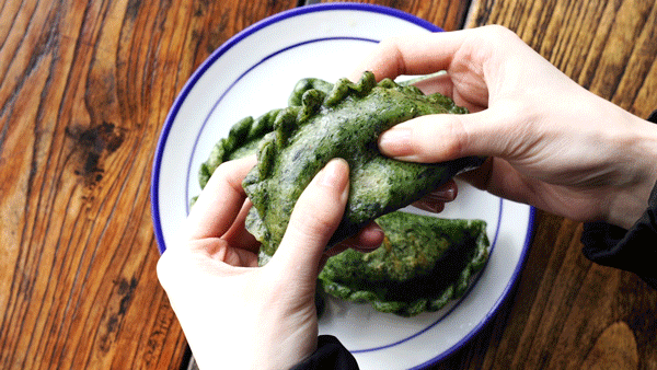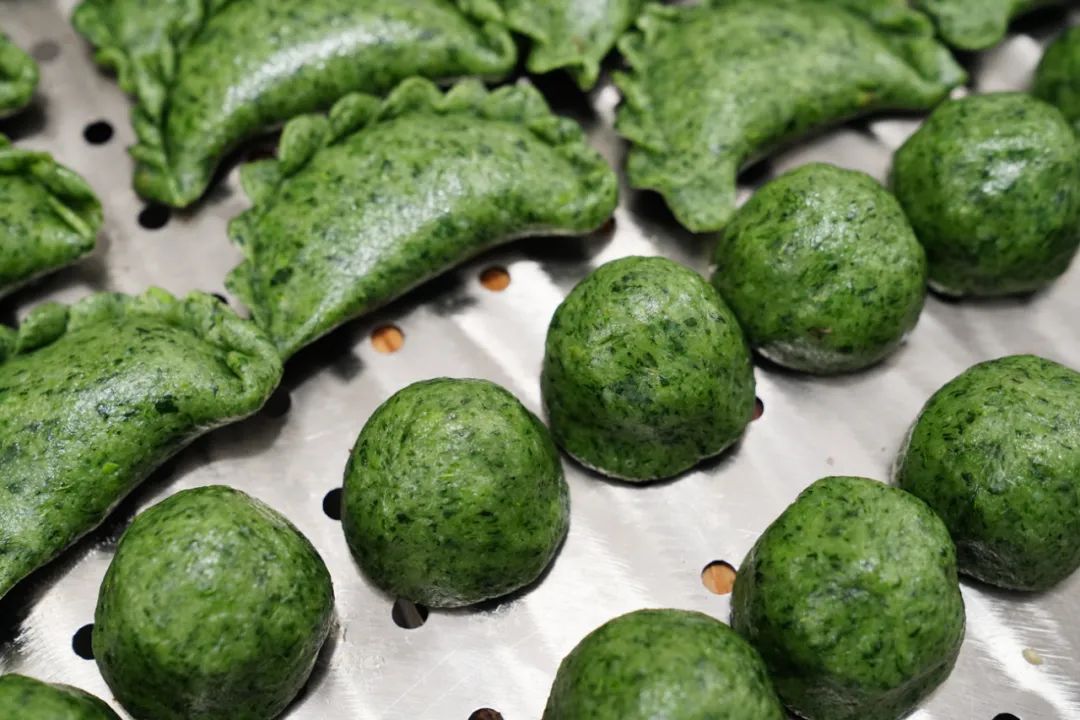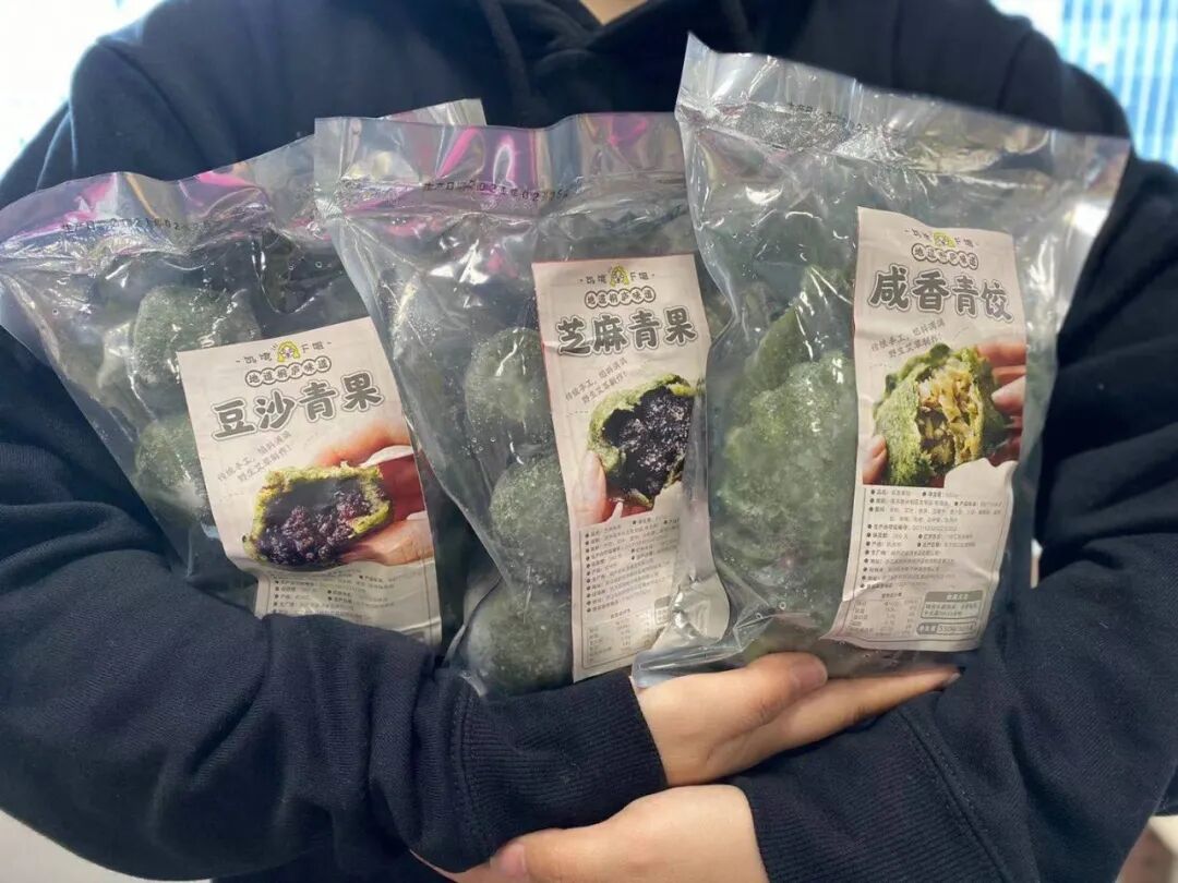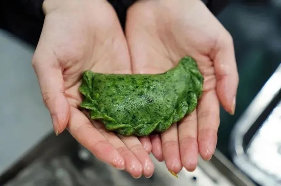 青團個頭飽滿、碩大,青餃放在手裡佔據大半個手掌;