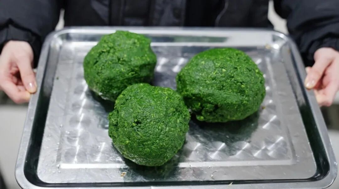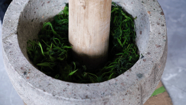 將新鮮艾草搗成碎末,與蒸熟的水磨粳米粉混合,揉出韌性十足的麵糰。