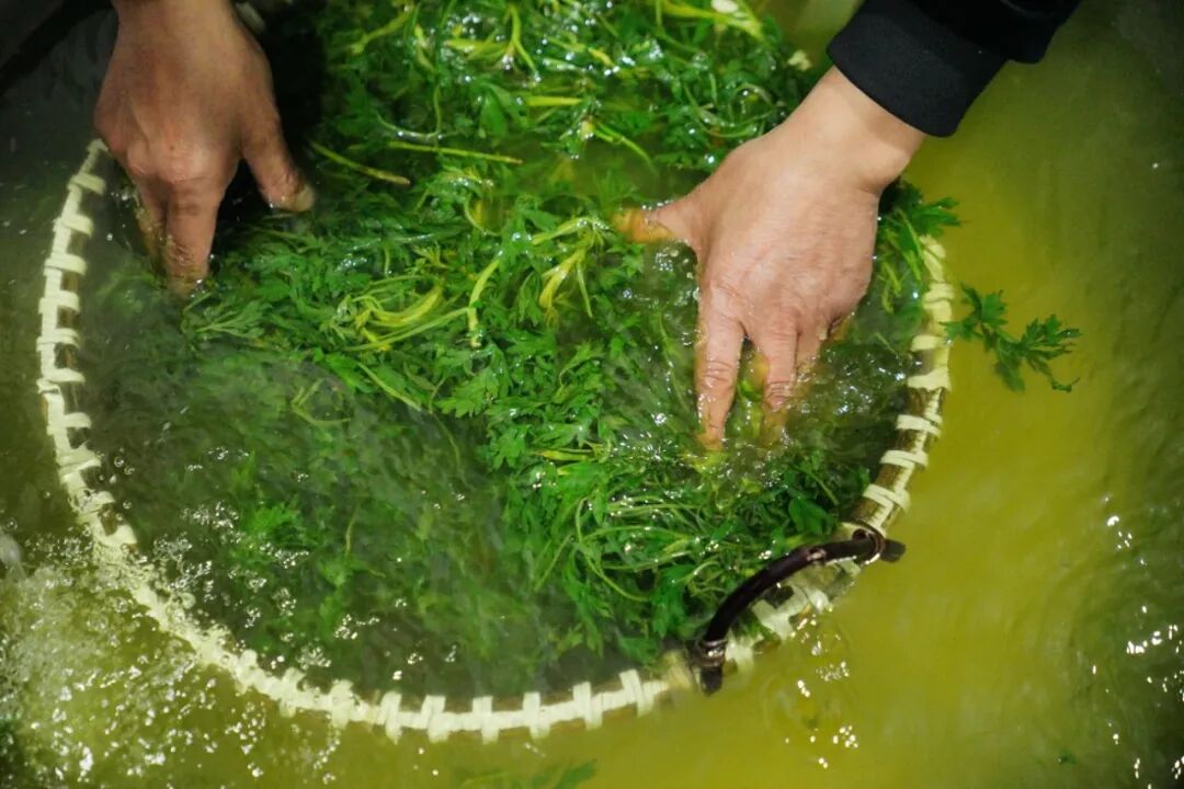 米粿叔處理細嫩的艾草,要用石灰水熗制24小時、再大火熬製去澀味,漂洗後再搗出漿汁。