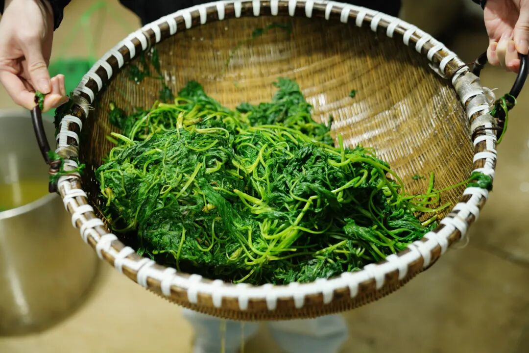 我們跟著米粿叔採摘艾草,摘完這滿滿一籃艾草,回去做青團咯。