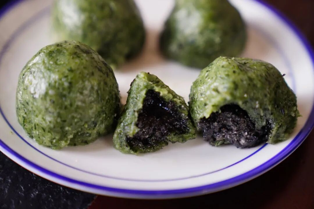 野生艾草做出來的青團,顏色偏黑,能明顯看到艾草,而且艾草清香,表皮光亮不粘牙!