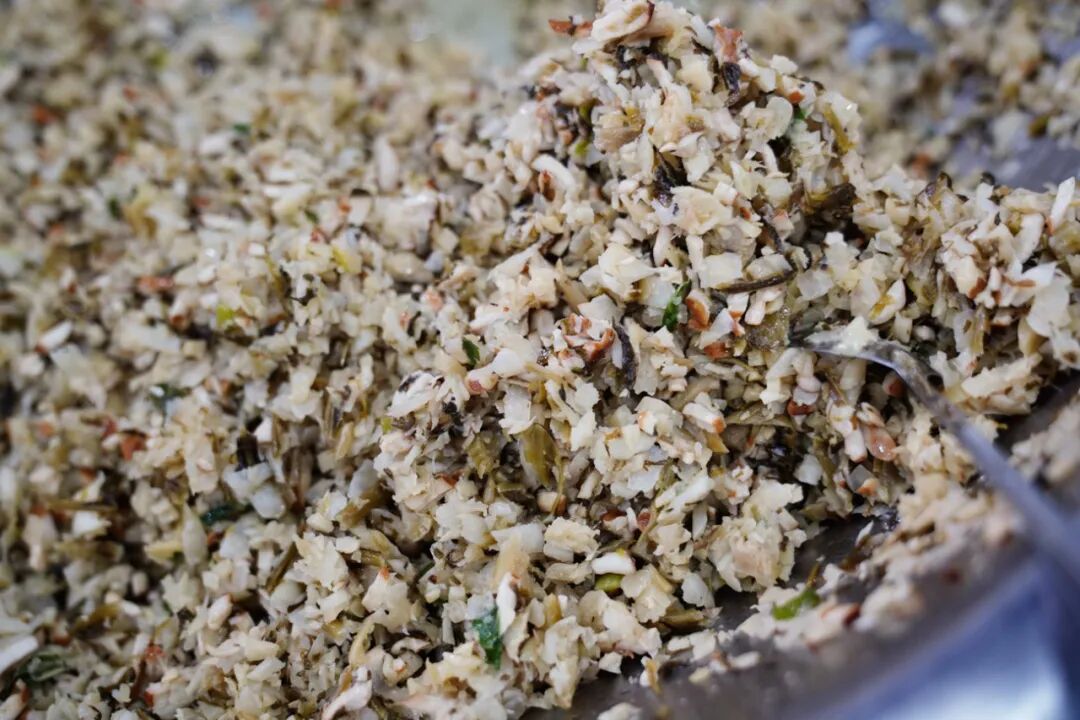 具有南方特色的雪菜筍丁餡,更是選用新鮮的食材,雪菜、豆腐乾、筍絲、蘿蔔翻炒,做餡。