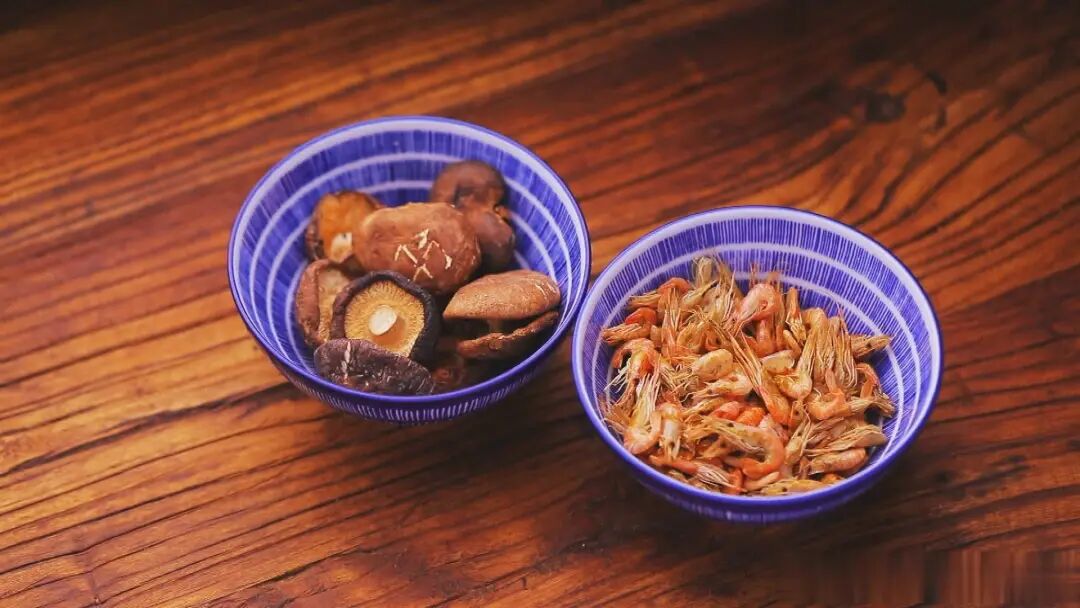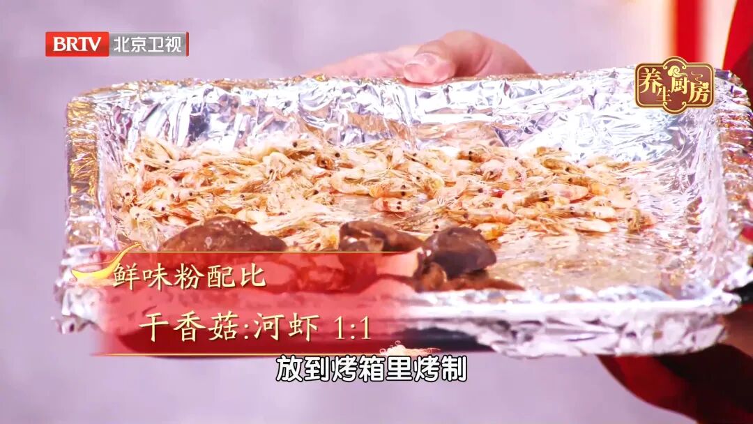 做法:等分量的幹香菇、小河蝦烤制後打粉。