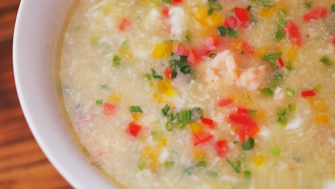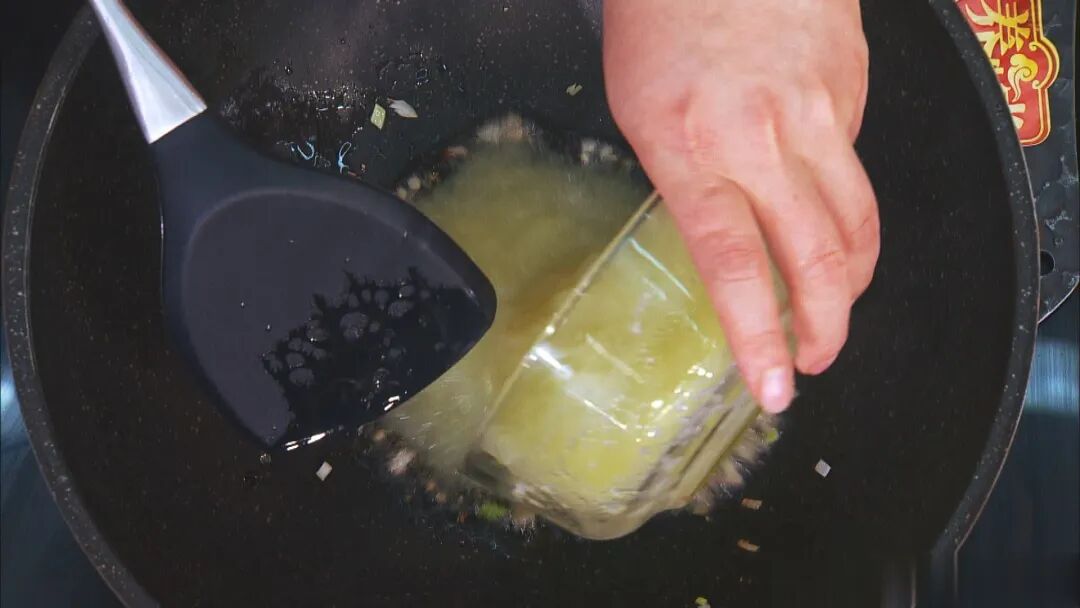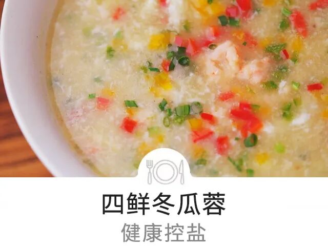 小火煸香蔥薑末,炒香冬瓜蓉加入開水熬煮3分鐘,加入蝦蓉、蘑菇湯汁、雞蛋清漿,撒上鮮味粉、枸杞子、蔥花和少量食鹽調味。