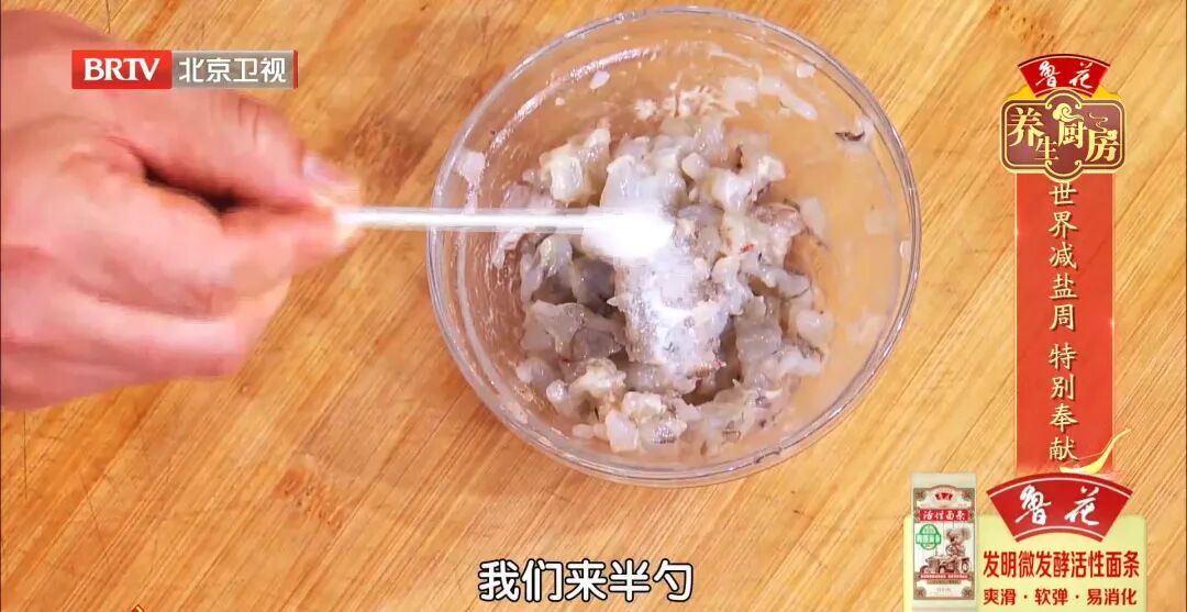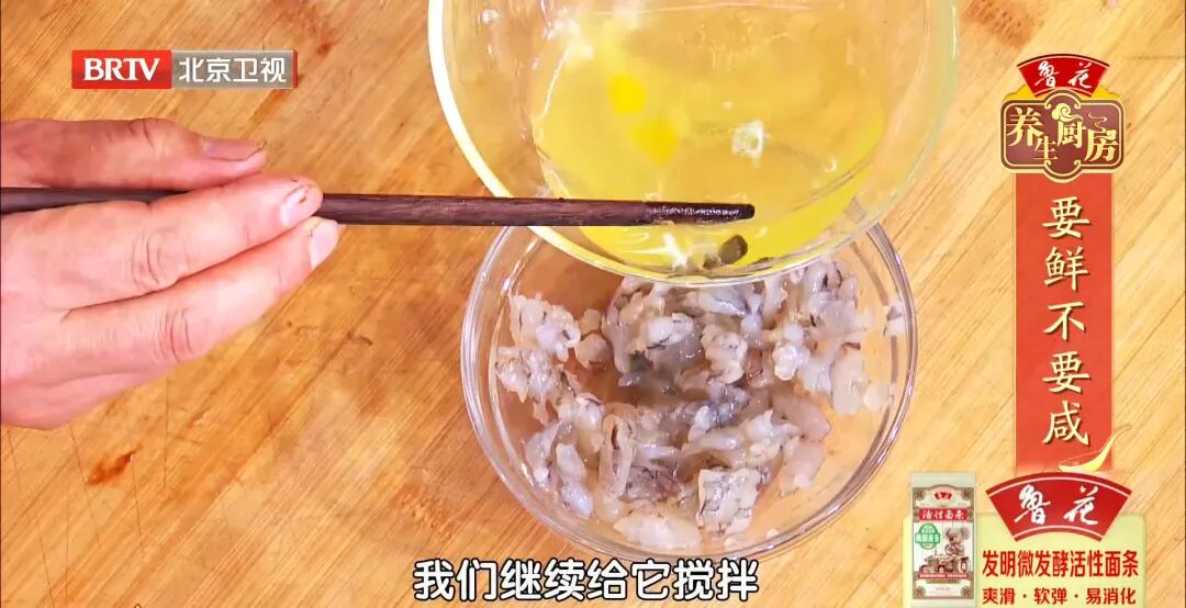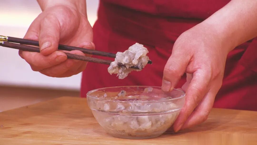 250克蝦肉切丁,撒少許鹽和胡椒粉調味,加入蛋清和15克玉米澱粉上漿醃製15分鐘。