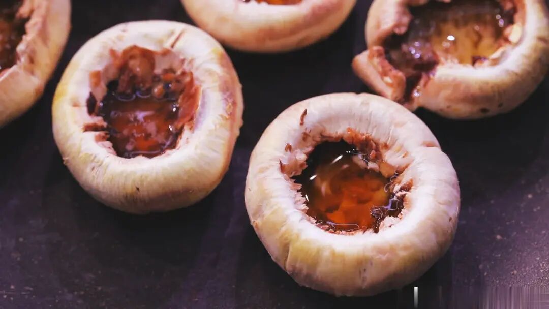 用牙籤在口蘑的2/3處扎幾個洞,小火煎制4-5分鐘出汁。