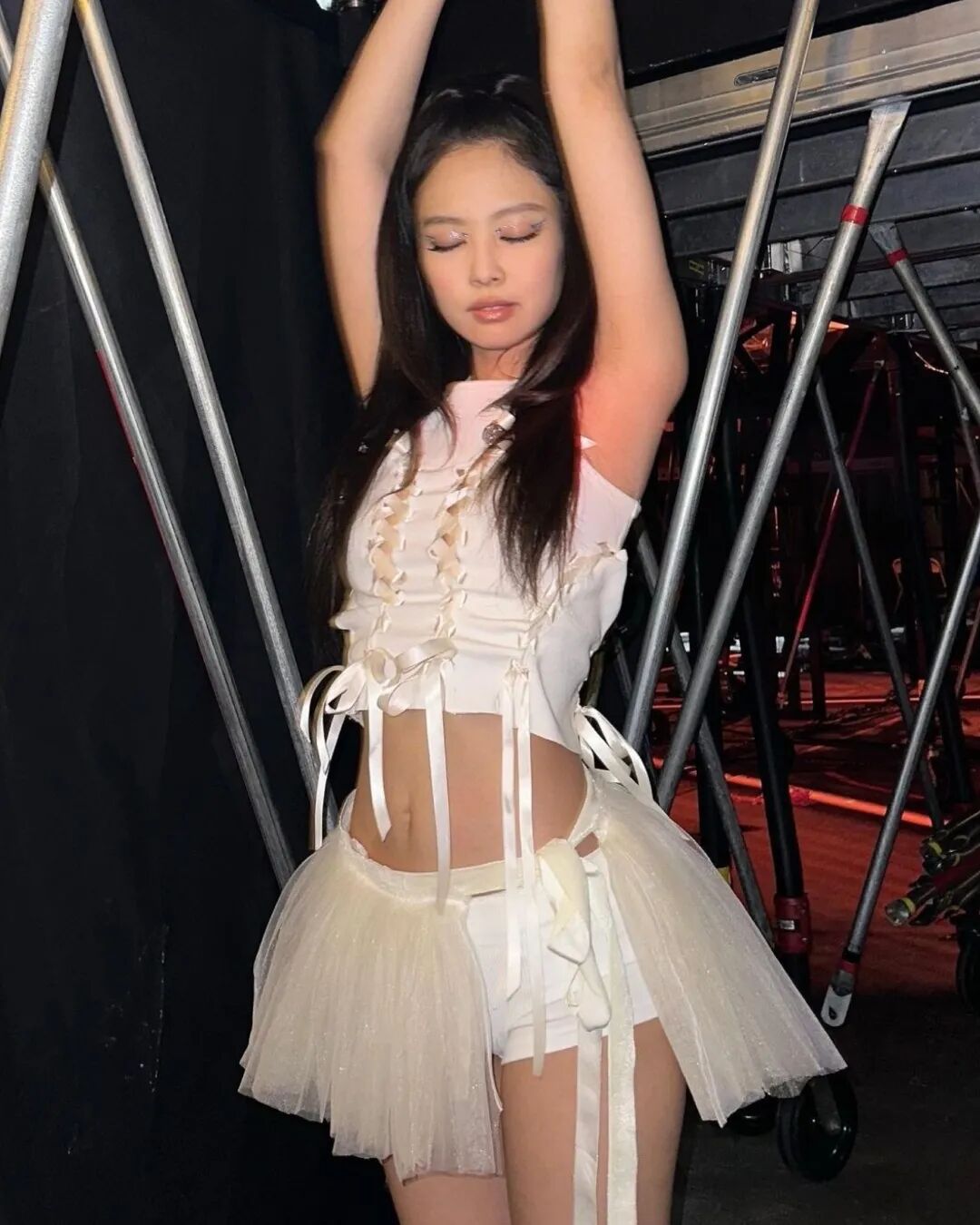 Jennie在全球巡演中就響應了balletcore美學,她運用不同廓形的修身上衣代替裹身衣,搭配芭蕾舞鞋、堆堆襪套,整體看起來又甜又辣!