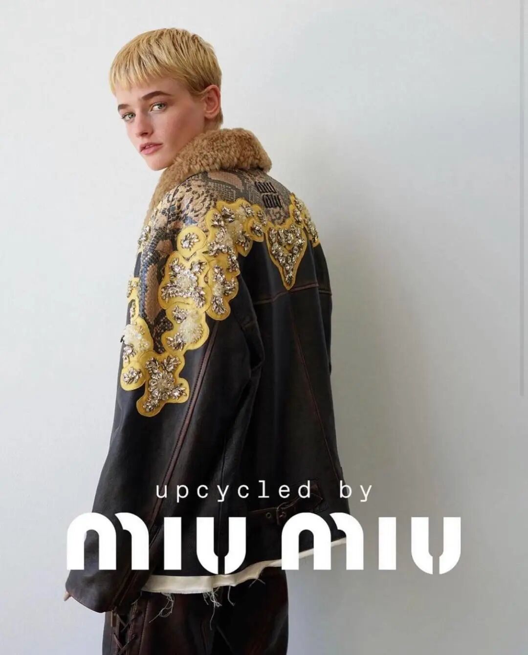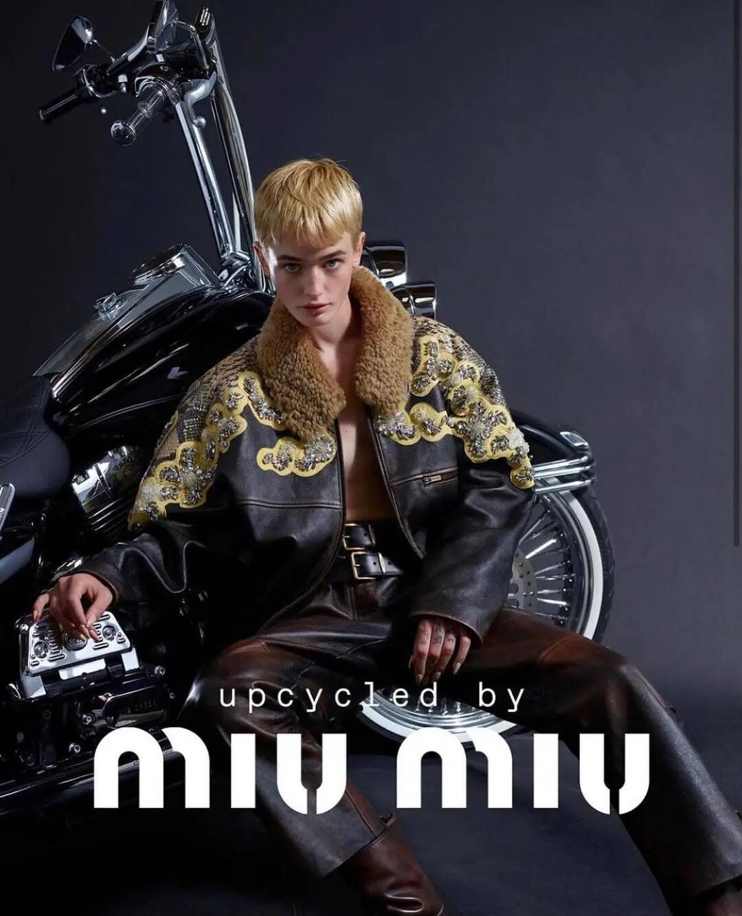 在Miu Miu 2022秋冬形象廣告中,身著皮夾克的她酷颯不羈、叛逆感十足,與Miu Miu的反叛精神完美呼應,感覺隨時會戴上頭盔騎重機揚長而去~▼
