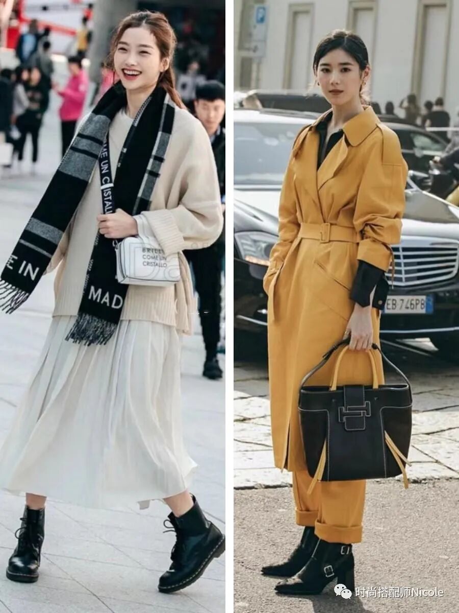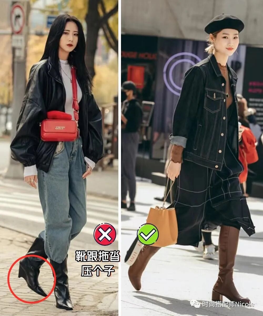 這組搭配好看的關鍵在於:一是腿要細、二是靴筒要細,粗腿就別模仿了,會顯下身更臃腫,而細靴筒是中和臃腫感的關鍵,靴筒一寬就真的邋里邋遢了。