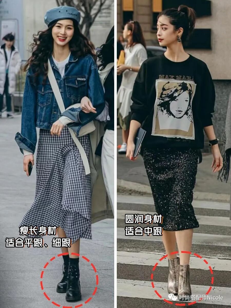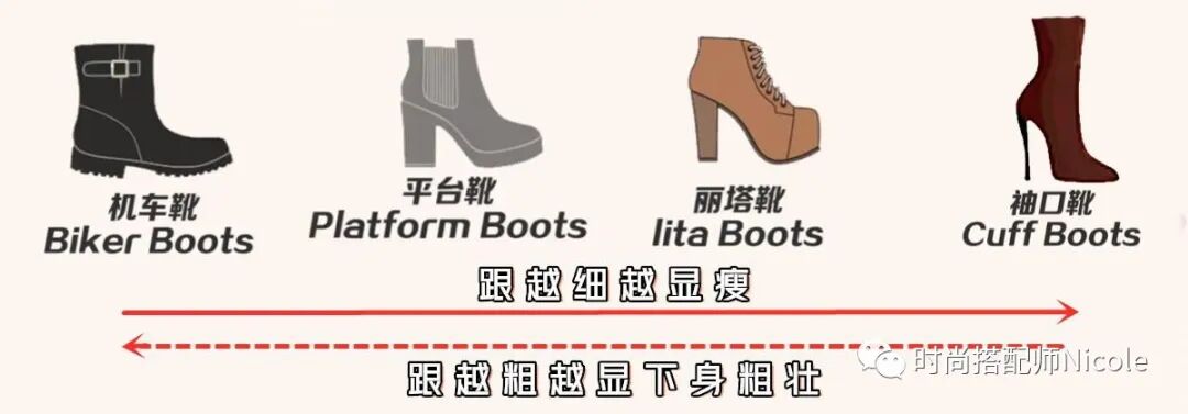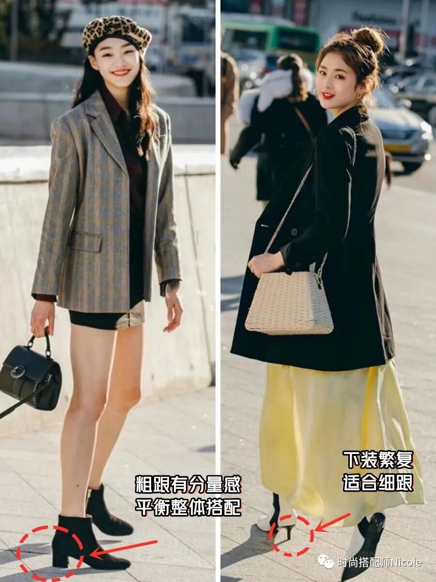 總的來說靴跟的粗細直接關乎下身的“重量感”,靴跟越粗,會讓下身看起來越發的笨重,所以在選擇靴跟粗細的時候,要根據自己的身材特點、穿搭特點來選。