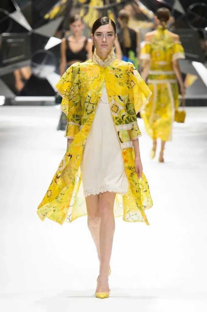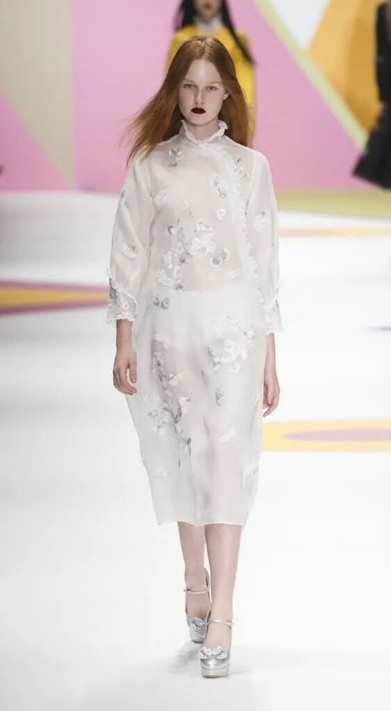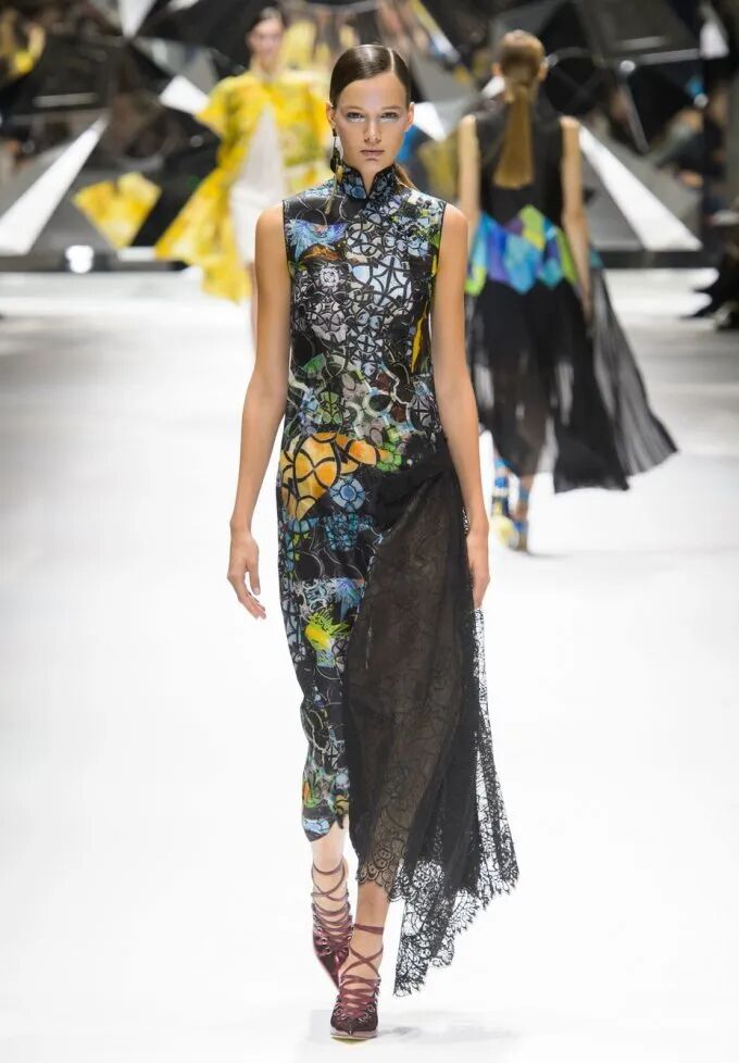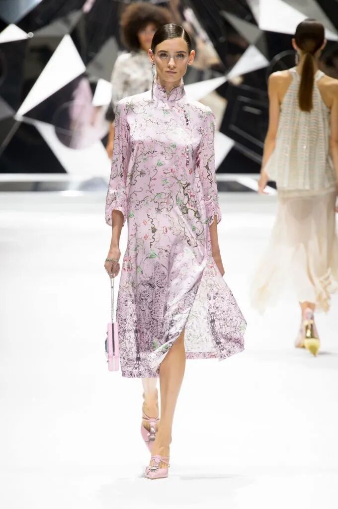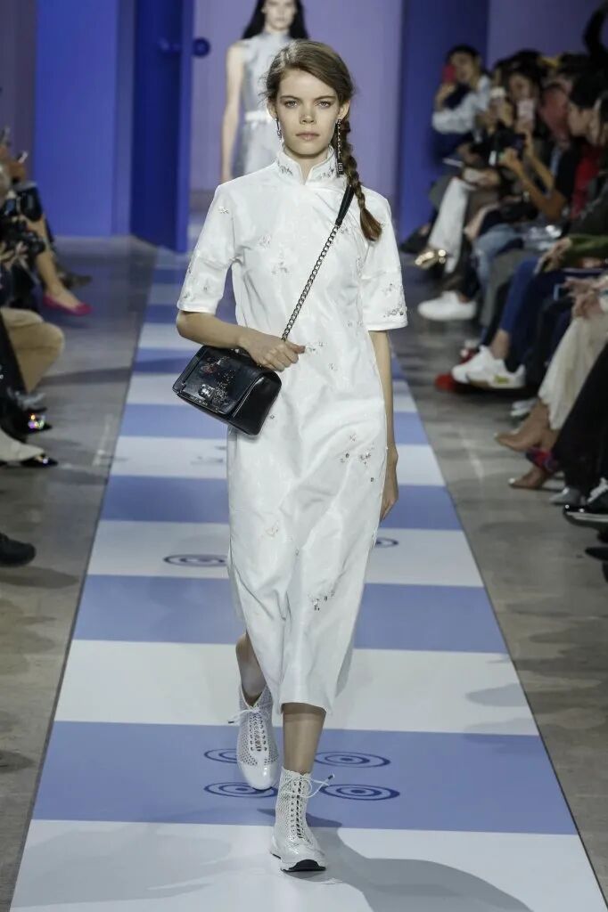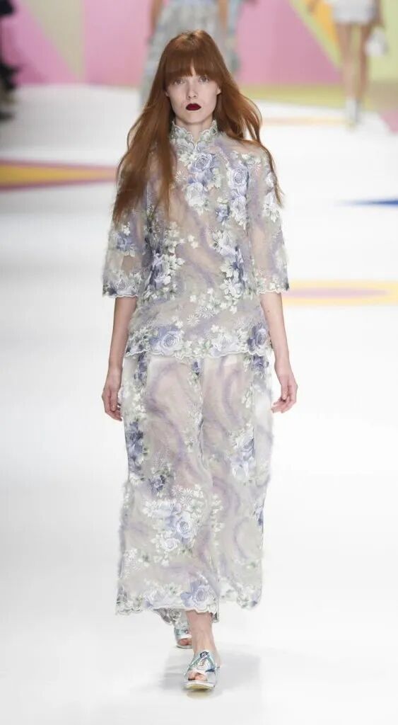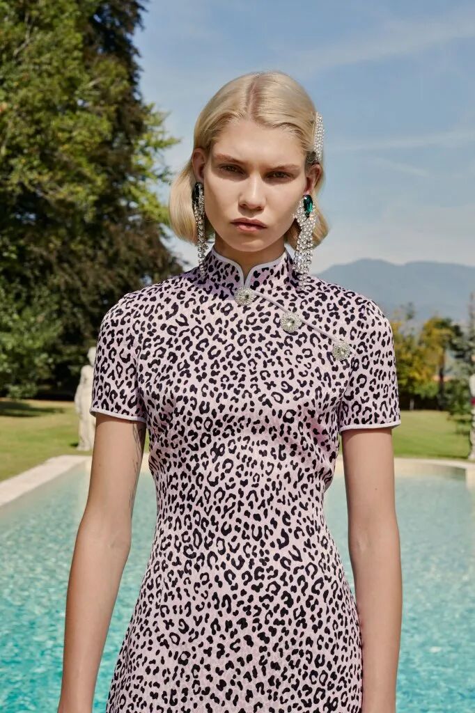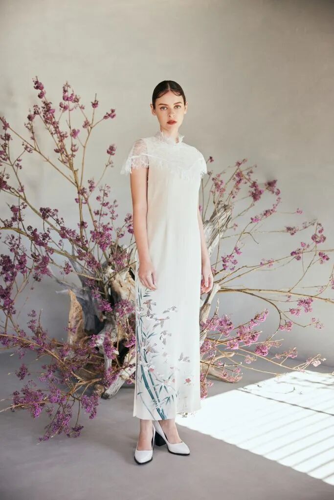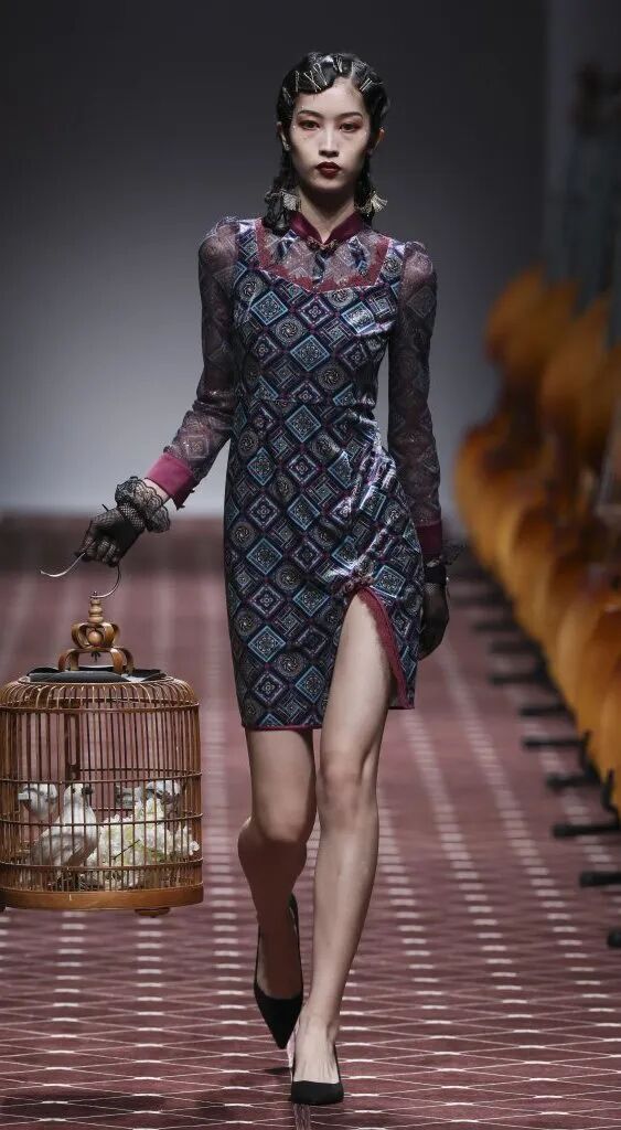旗袍元素經常與蕾絲擦出火花,古典與嫵媚完美結合。經過精美刺繡和迷幻幾何印花的打造,旗袍這一中國傳統服飾,增添了幾分現代感,不僅婀娜多姿,也更飄逸靈動了。