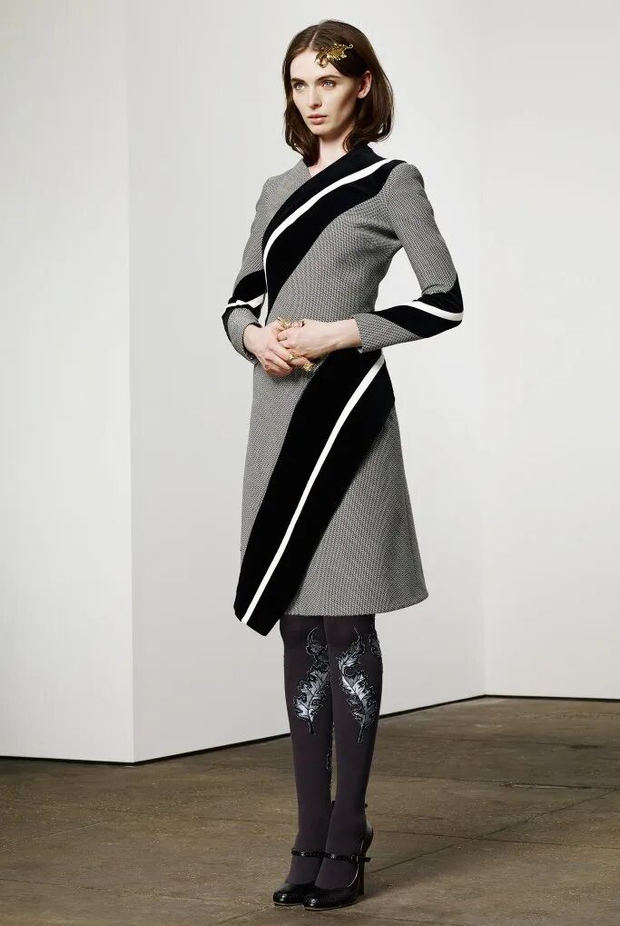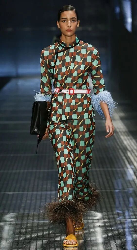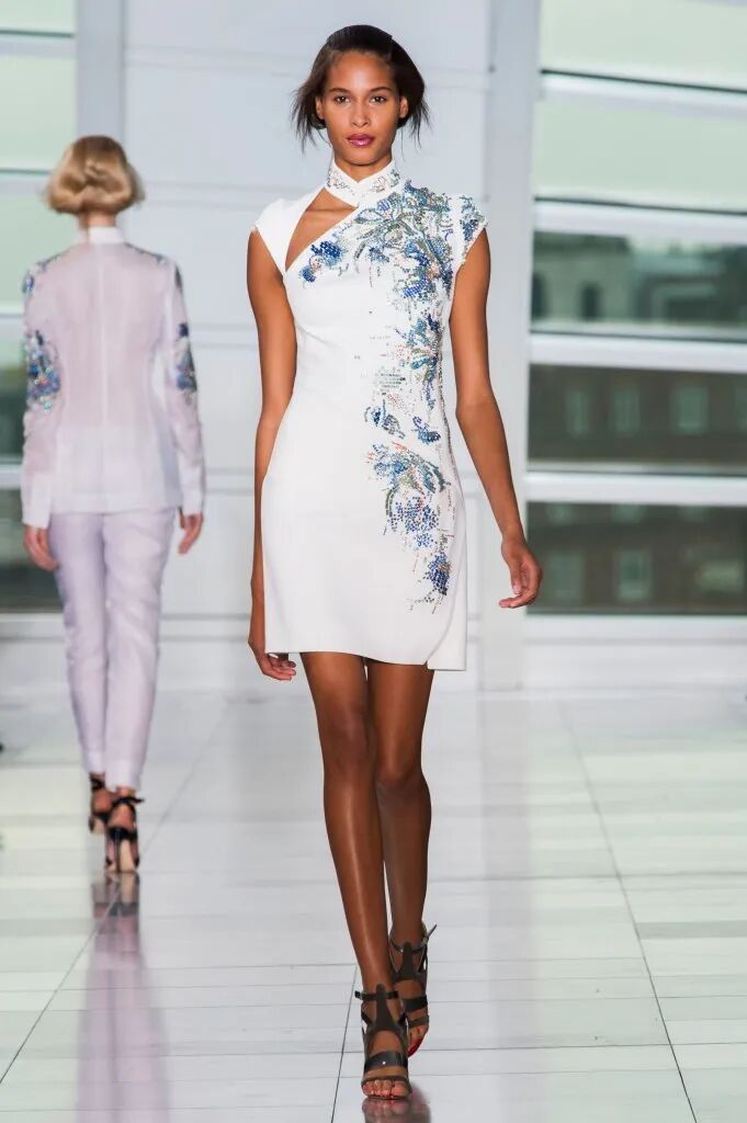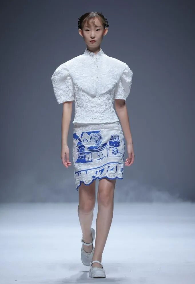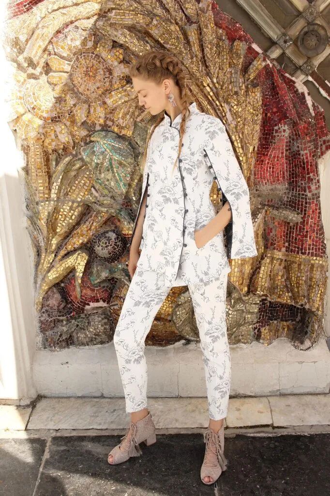 運用旗袍傳統元素盤扣、立領,展現出優雅多姿的古典女子形象。出現在袖口及褲管處的羽毛元素,輕盈、隨性而又充滿西方風情,這樣獨特的組合,呈現了一場中西時尚文化的華麗碰撞。