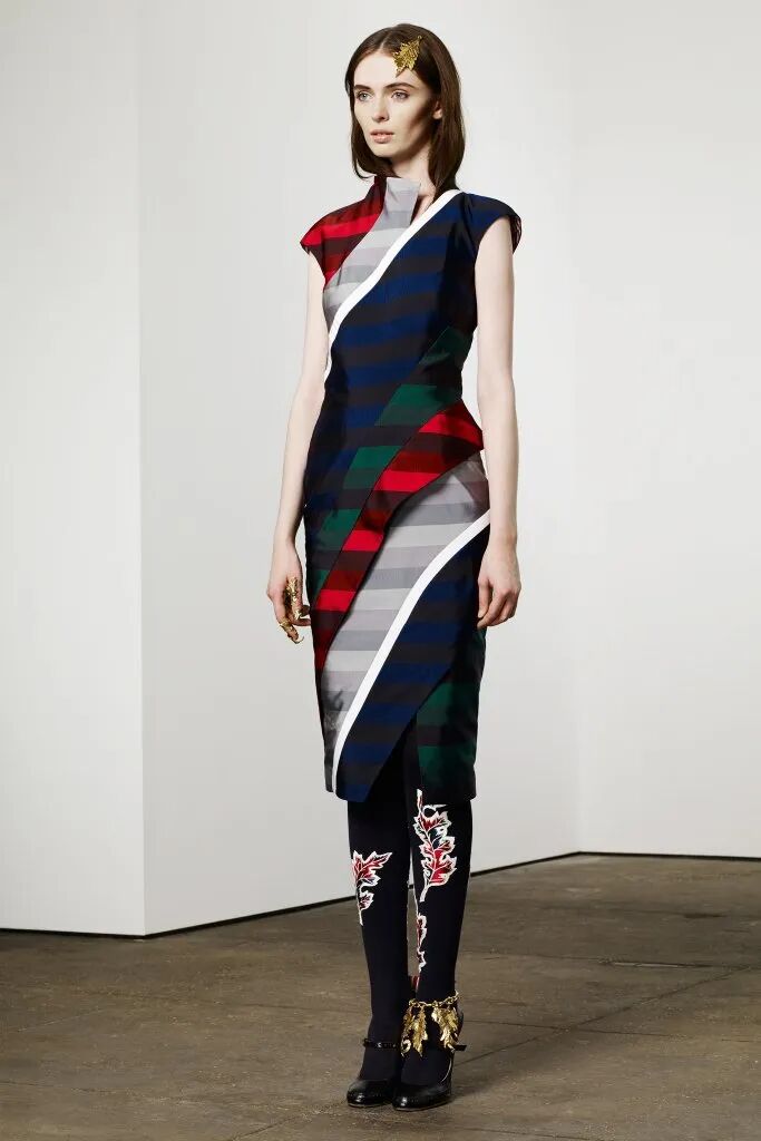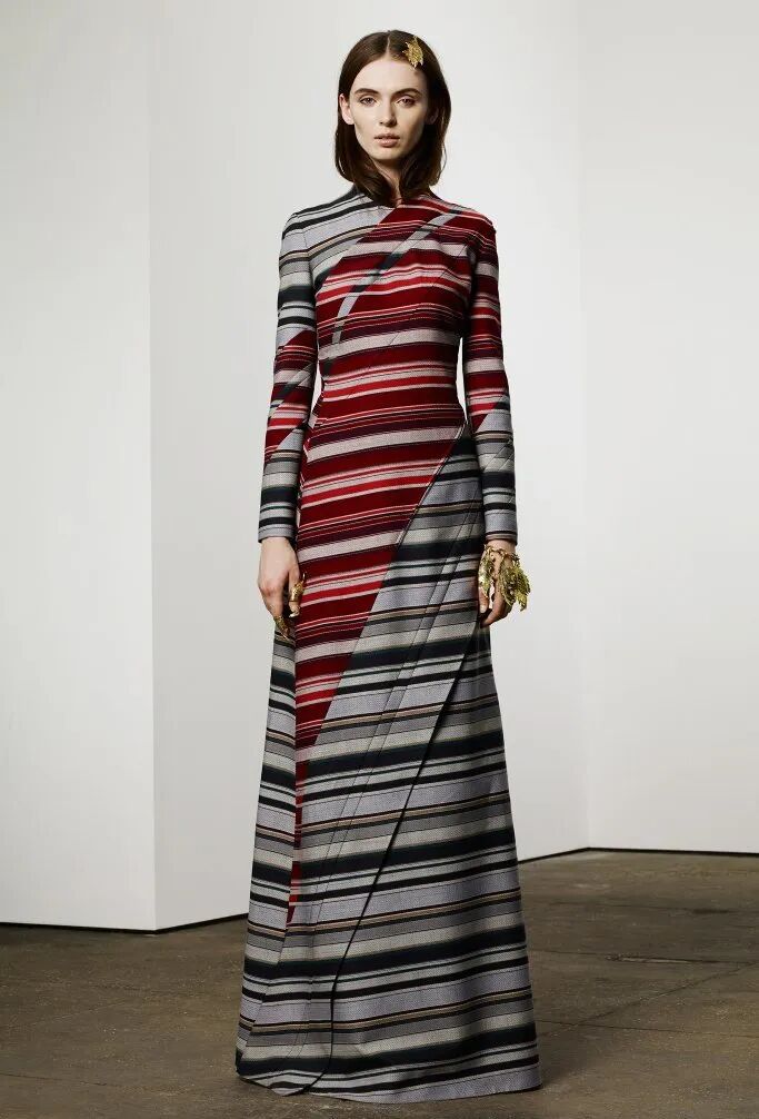藍、綠、紅、灰色的條紋布料組成新式旗袍,拼接的手法讓傳統服飾煥發出新光彩。