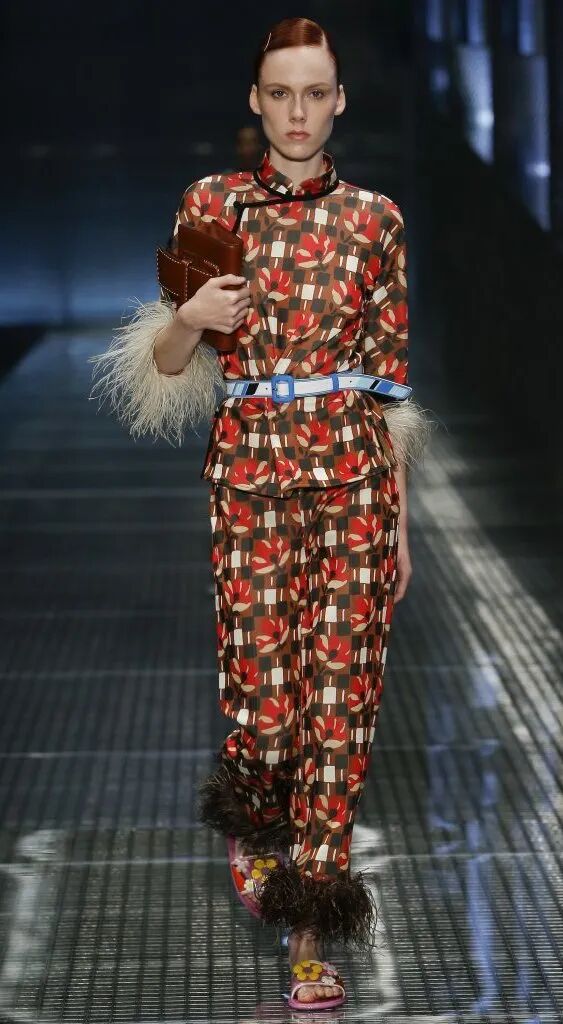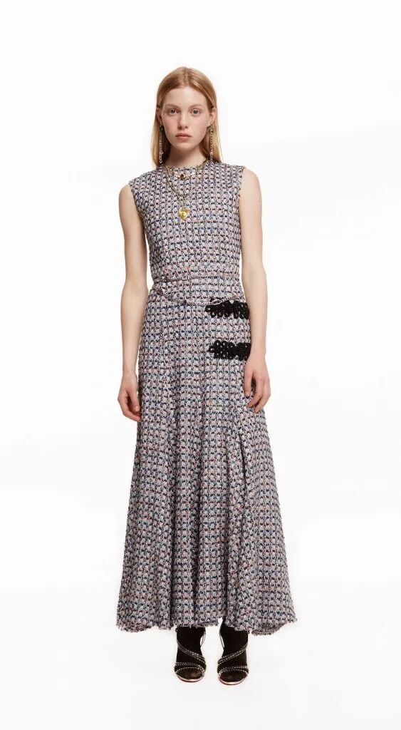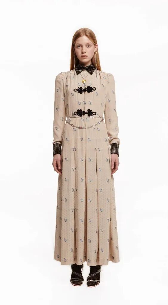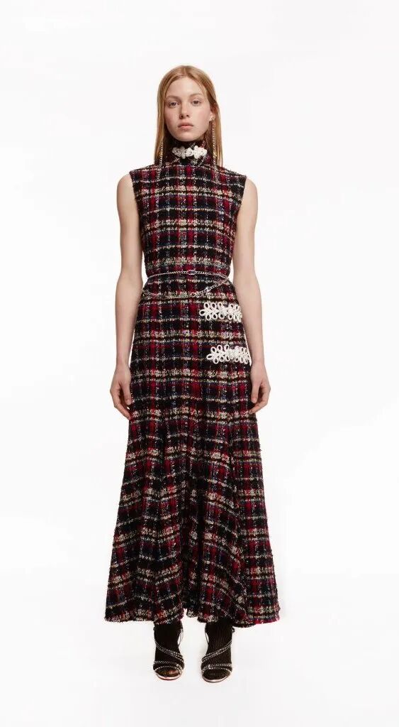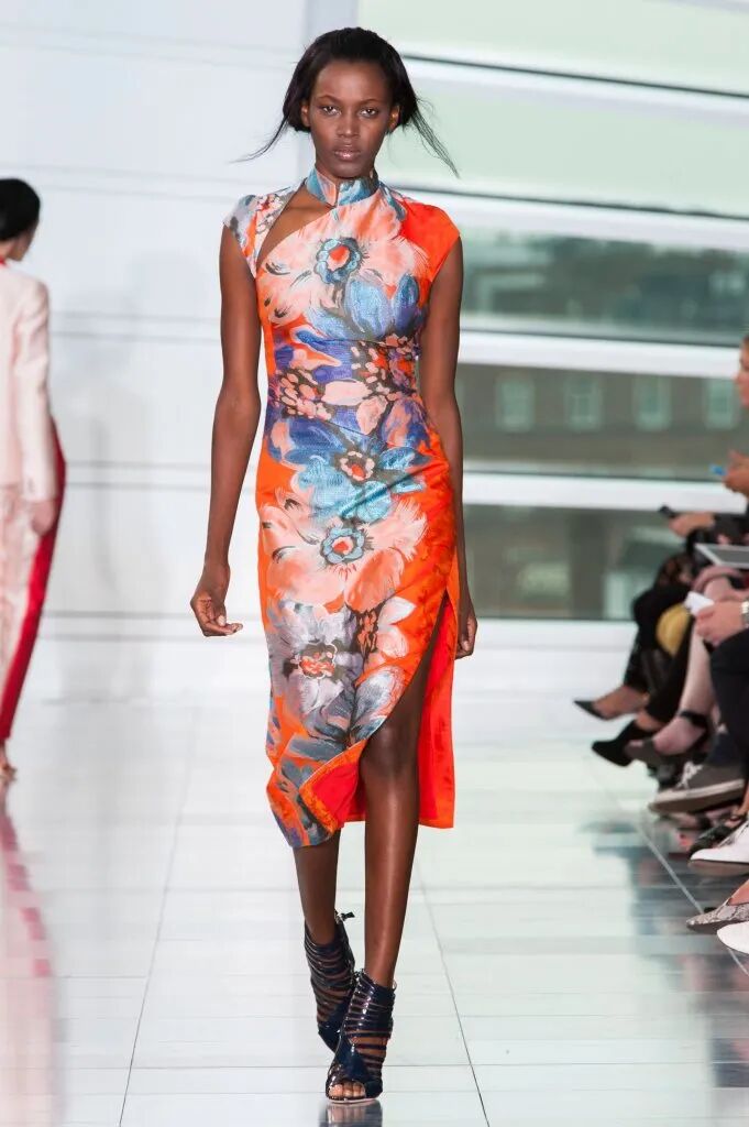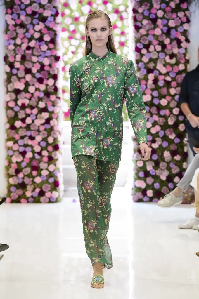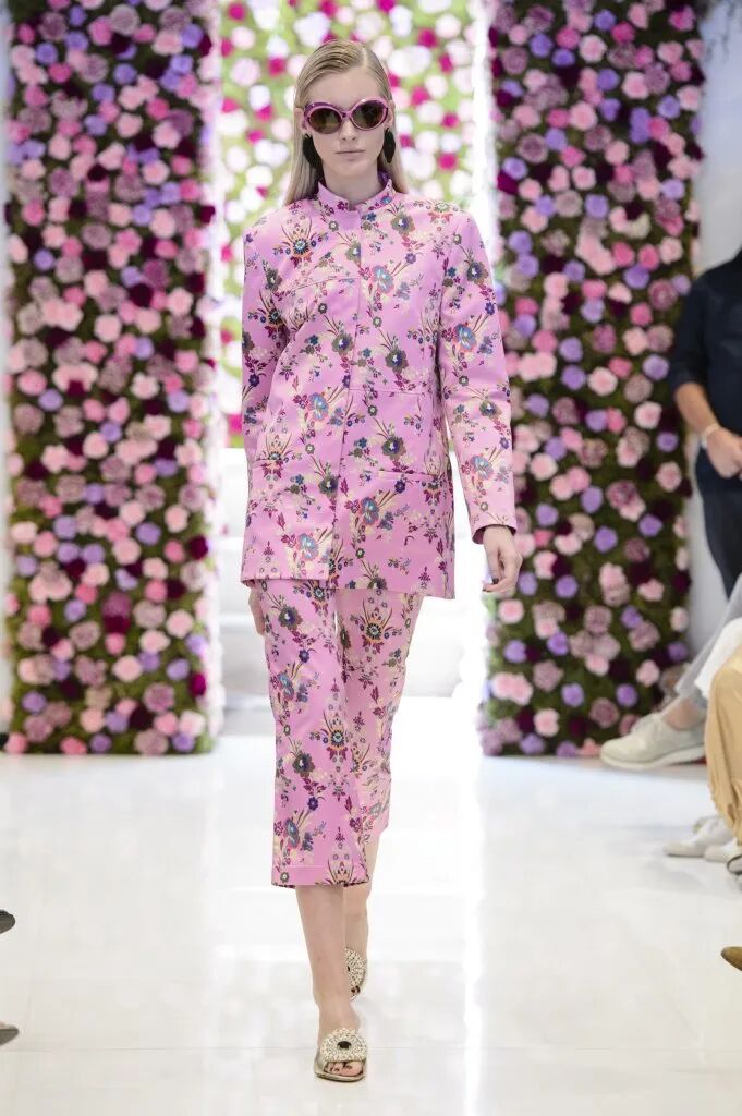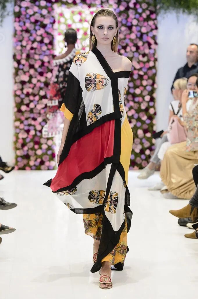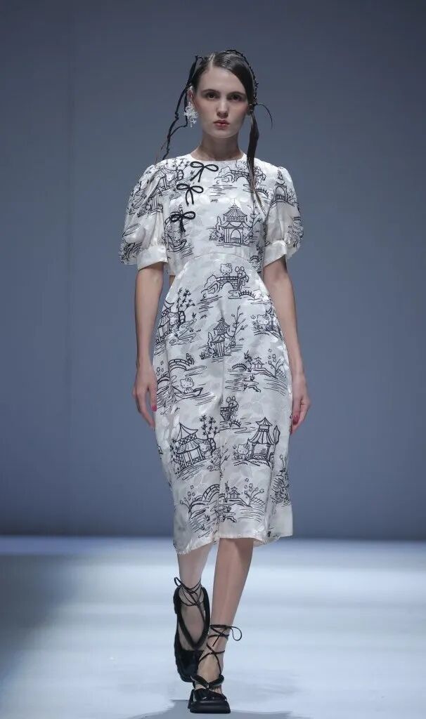 中式旗袍對禮服長裙的影響是巨大的,從凸顯身體曲線的裹身設計到領部細節,而戲曲面具、“躍龍門”的錦鯉、盤旋的龍、豐富的花卉等印花元素,則表現了設計師對中國風的熱愛。設計師把色彩花卉面料進行重塑,在中性套裝模式中融入女性化浪漫主義氛圍,讓新中式風格更多樣化了。