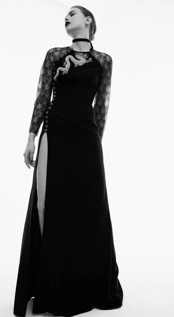 從圓潤的包邊袖的薄紗禮服,到側面高開叉的無袖連衣裙,再到性感優雅的裹身版型,以及斜襟領、滴水領等旗袍領的運用,結合奢華的明黃提花緞面,以及盤龍刺繡等等,無處不在地彰顯著旗袍元素的精緻與時髦。