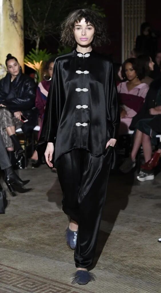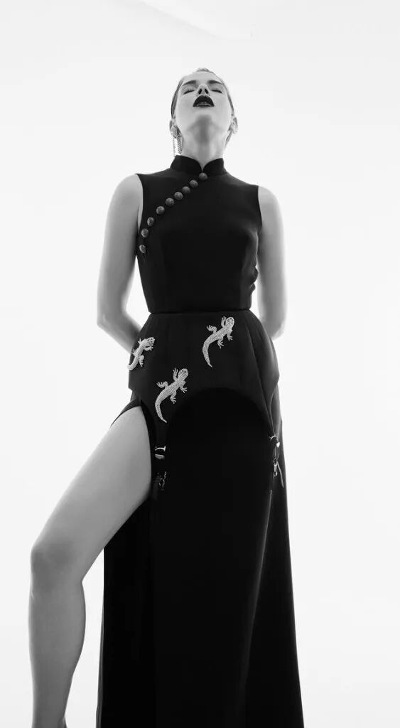 不要以為旗袍元素只能是甜美女孩的專利,旗袍元素也可以打造出酷帥風,讓整體色調偏冷靜,結合利落的剪裁,帥氣的風格就拿捏到位了。