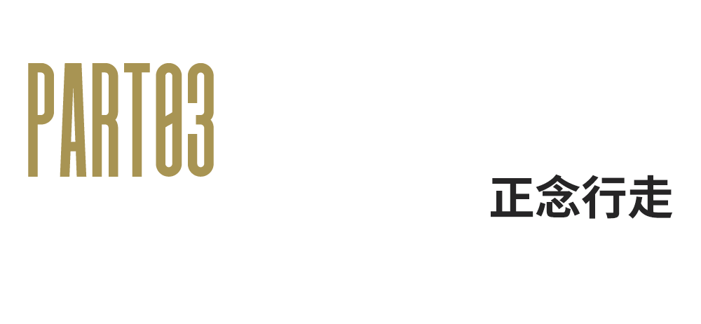 正念行走,是一次身心的冥想。把注意力放在腳上,觀察雙腳抬起,向前移動,落在地面的過程,不斷重複這個過程,當意識跑掉時,就標記它,再回到雙腳上。
