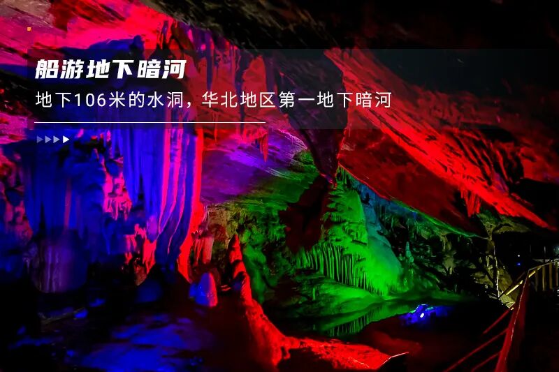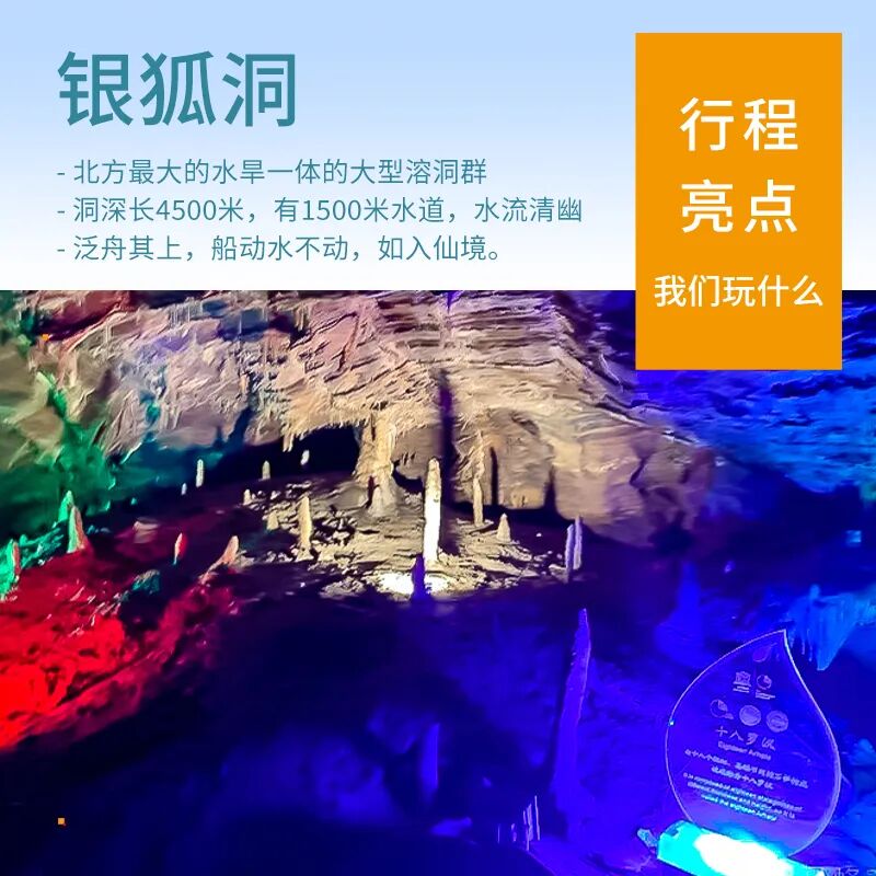 銀狐洞是自然形成的溶洞,有一條開放的地下暗河,洞內石塔、石柱、石筍、石花等景觀豐富,最為著名的景觀就是晶瑩剔透的毛狀晶體,地下暗河清澈見底,9人坐一條小船,通過船長拉住頭頂上的鋼絲繩滑動船體,洞內恆溫,冬暖夏涼,夏天遊覽需穿長袖衣褲,遊覽總長約3公里。