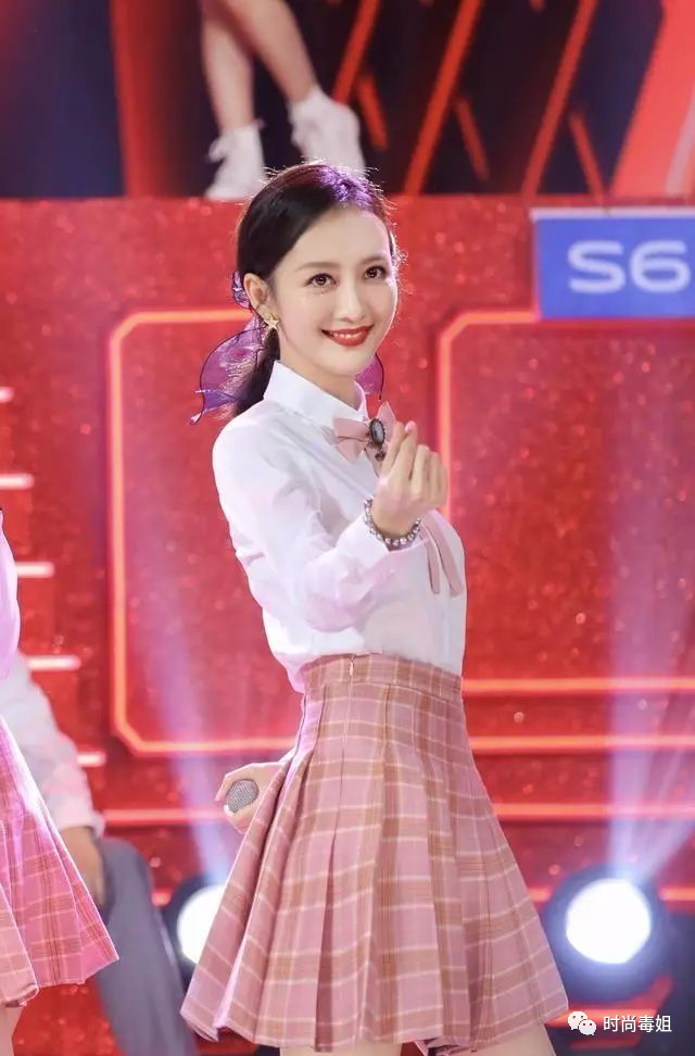 時下最為流行的風格也就是女團風,其中百褶裙的這種風格最為顯著,對於年輕女性來講,不同的款式都可以進行嘗試,同時也可以搭配白色的襯衫,比如王鷗的這身造型,看上去非常少女,白色的襯衫搭配格紋百褶裙,粉粉的色調清新可愛,又不失時髦。