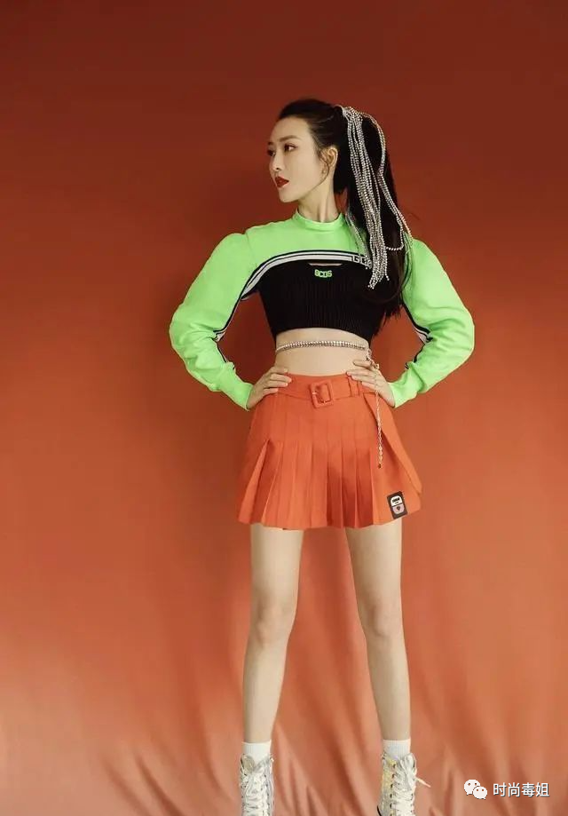 再看這身造型,百褶裙不僅可以可愛,同樣也可以是性感或是洋氣,如果想要打造出更具個性的造型風格,可以挑選一些色彩飽和度較高的款式,就像王鷗這件橙色百褶裙搭配熒光綠的上衣,視覺效果非常強烈,整個造型相當驚豔。