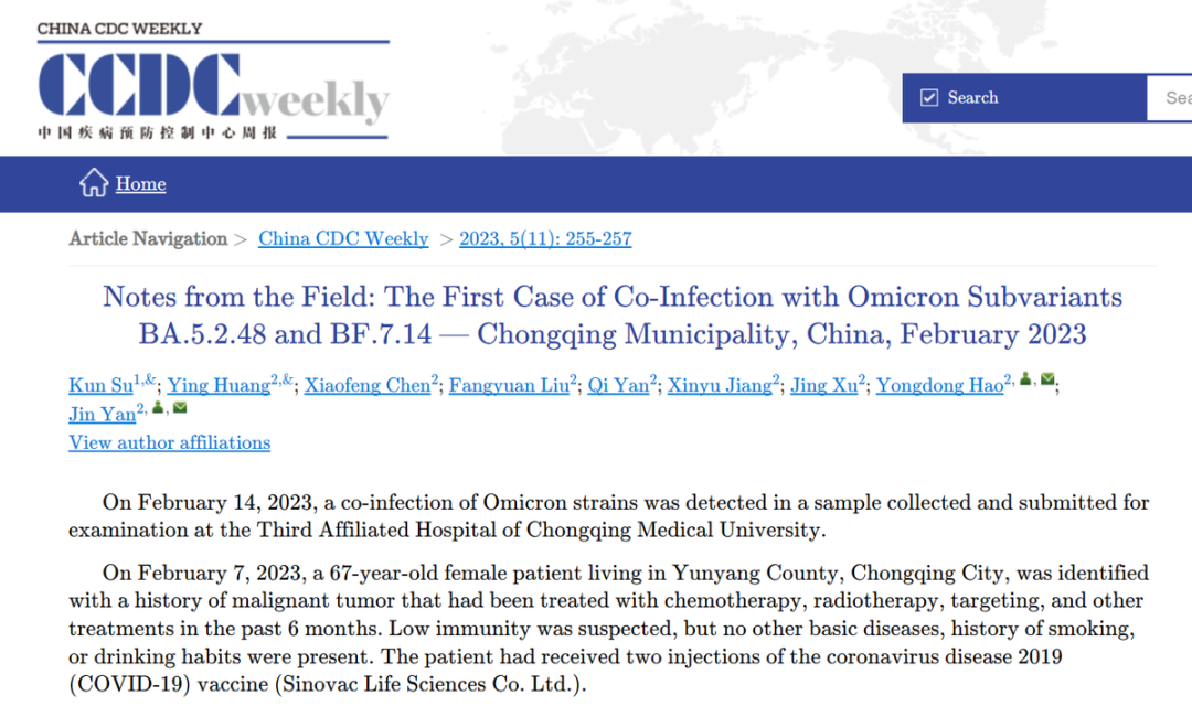 3月17日,中國疾控中心網站公佈最新的《中國疾病預防控制中心週報(China CDC weekly)》顯示,在重慶醫科大學附屬第三醫院採集並送檢的樣本中,檢測到奧密克戎BA.5.2.48和BF.7.14亞型共同感染的病例。